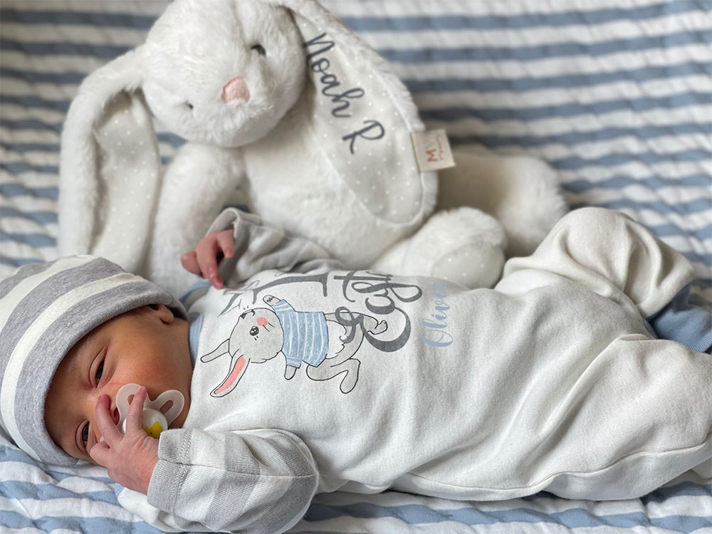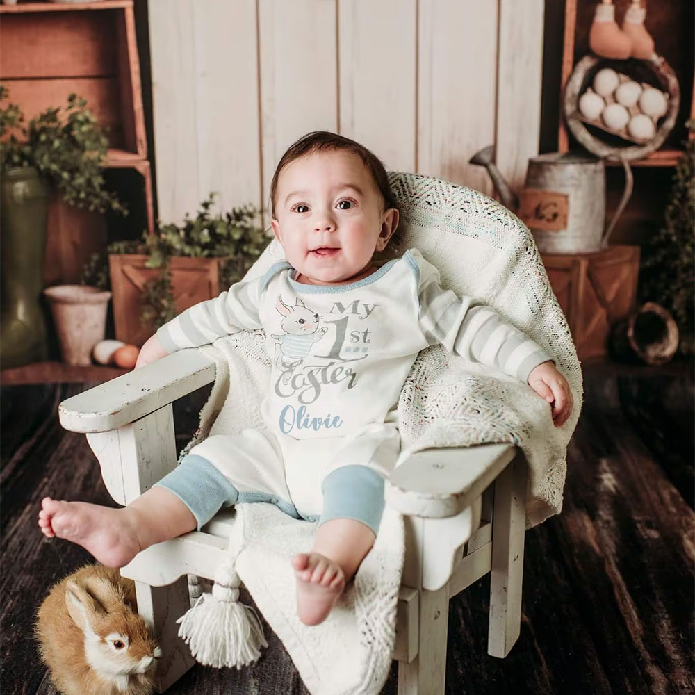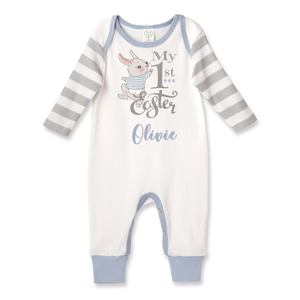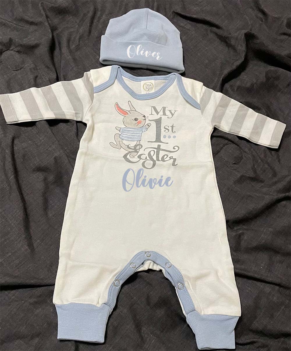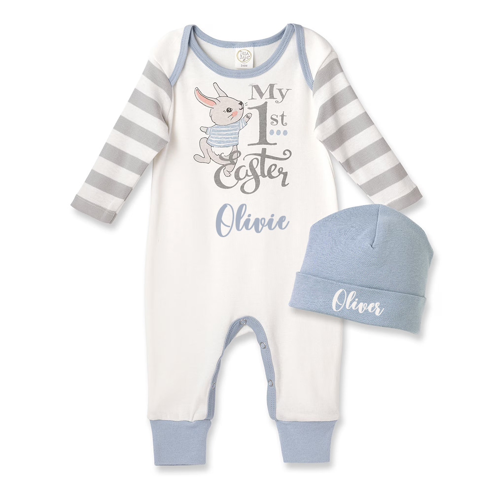 Baby Boy Easter Outfit with "My 1st Easter" front graphic. He'll be outfitted cute and comfy in our super-soft 100% cotton rib material. Optional matching hat completes the outfit! THIS ITEM IS SPECIALLY PRICED AND IS NOT RETURNABLE. PLEASE CHECK DETAILS CAREFULLY BEFORE ORDERING.