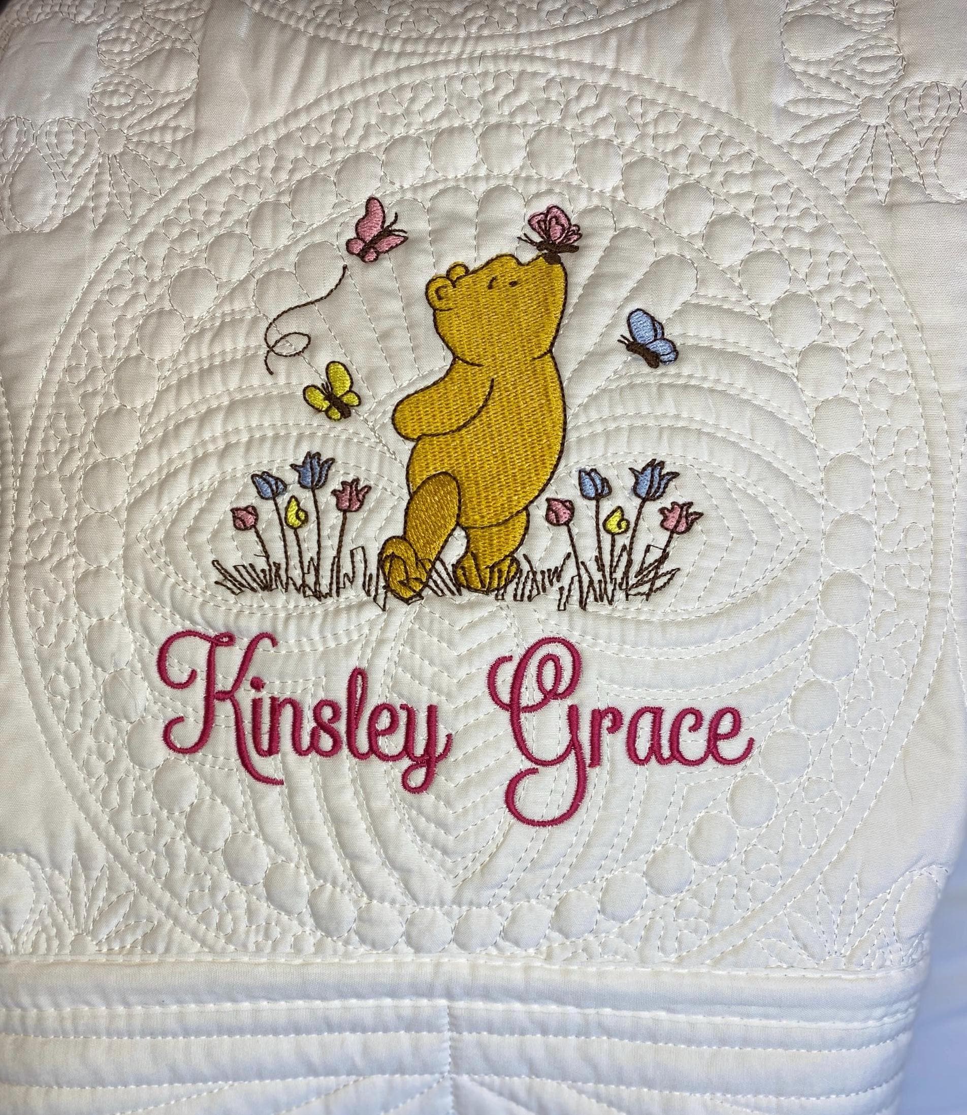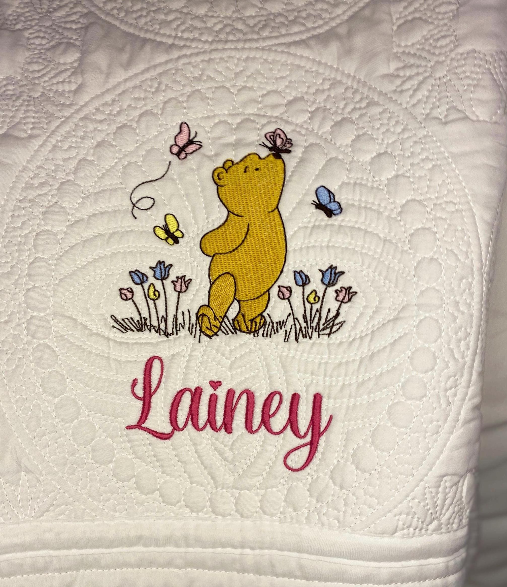 Welcome a new baby into the world with this beautifully embroidered Winnie-The-Pooh quilt, featuring a charming bear with flowers and butterflies design. A perfect blend of warmth, style, and personalization, this quilt makes a thoughtful and unique gift for any little one.