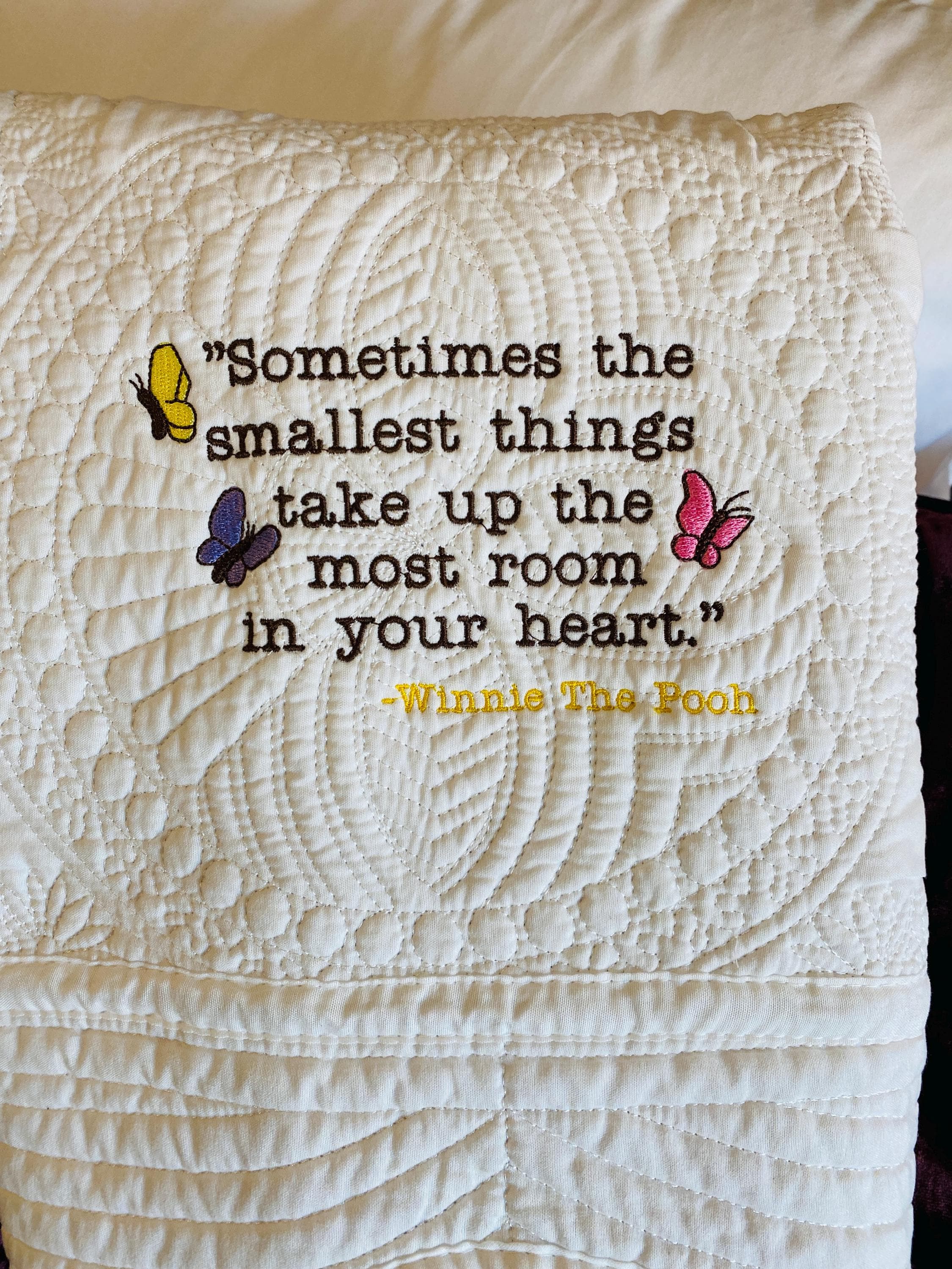 Classic Winnie-The-Pooh Personalized Embroidered Heirloom Baby Quilt - option to add Winnie-The-Pooh saying "Sometimes the smallest things take up the most room in your heart."