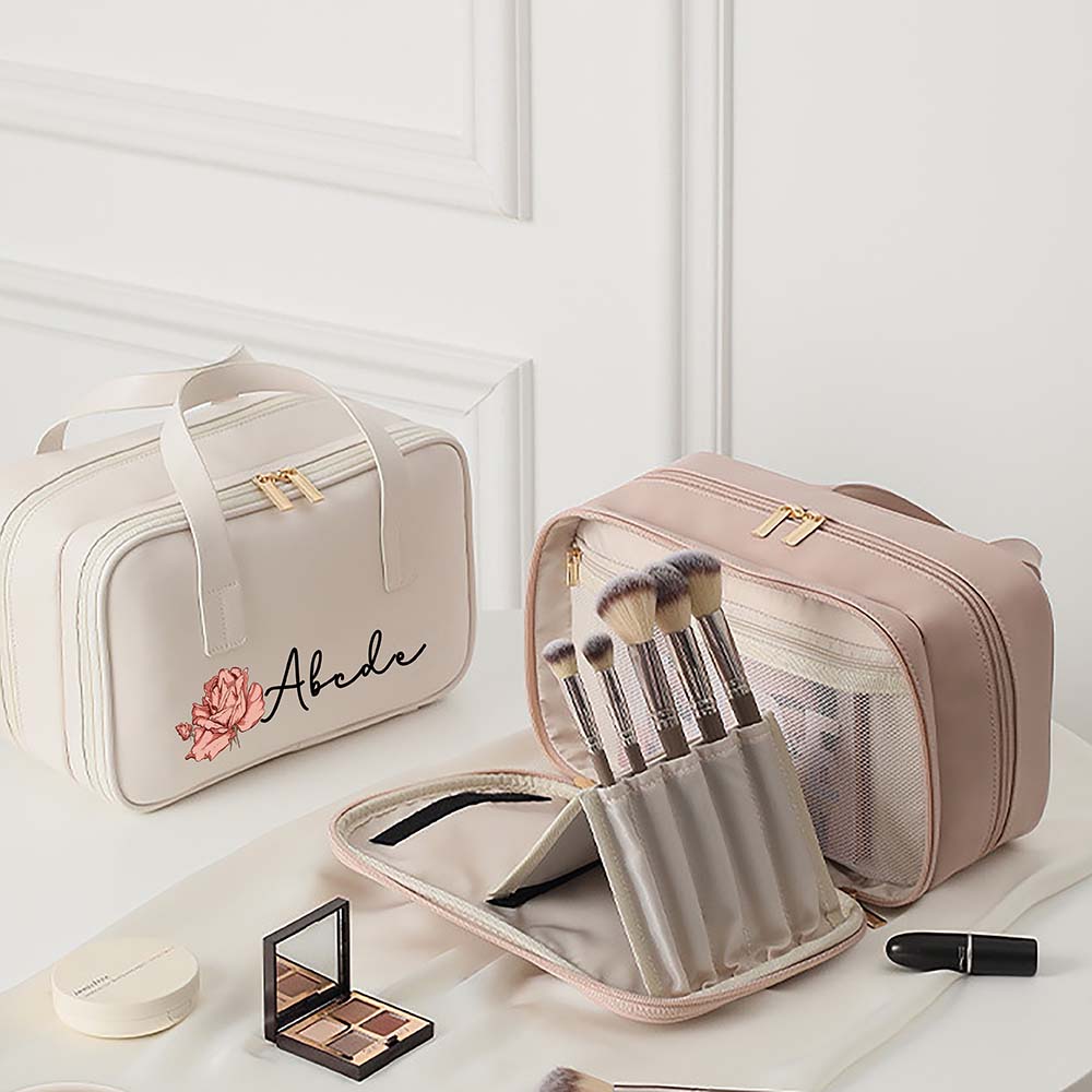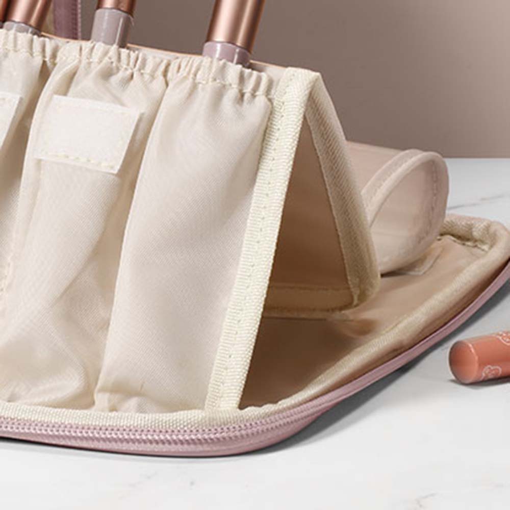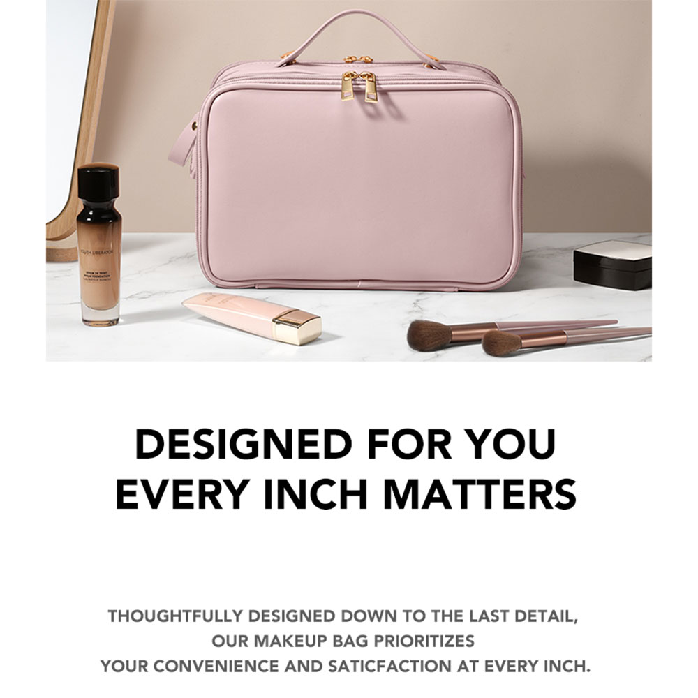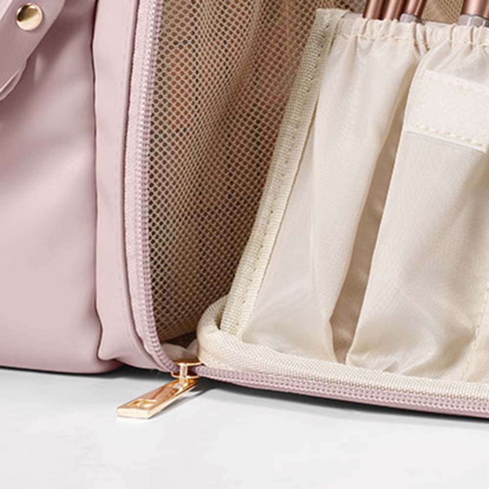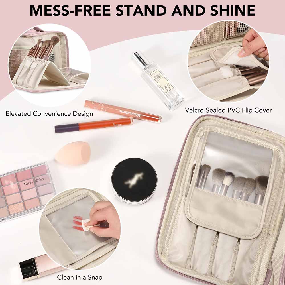 The secondary bag includes a brush position for storing a set of makeup brushes as well as 2 partitions in the storage layer: a mesh pocket for eye shadow storage and a TPU splash-proof baffle to isolate residual powder.