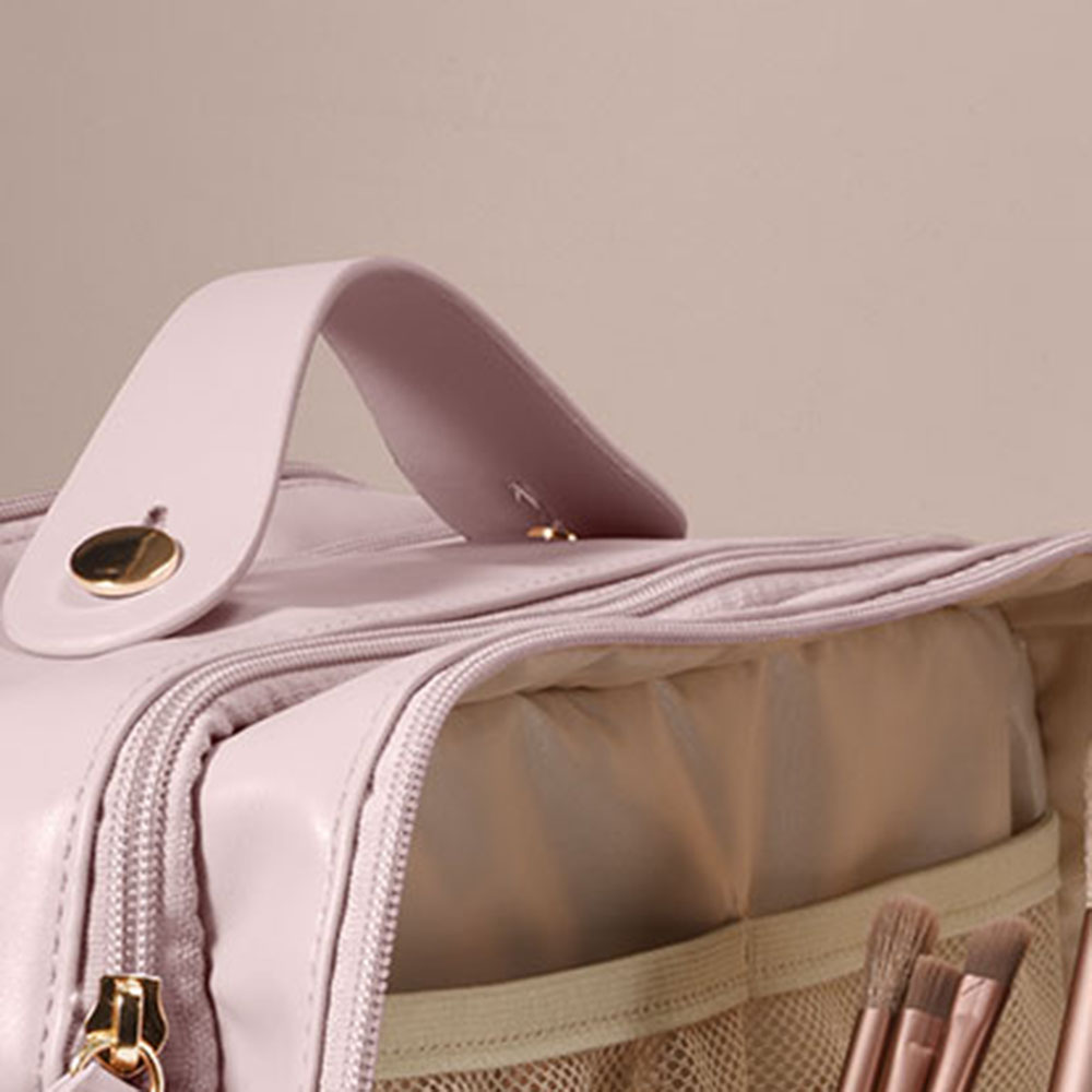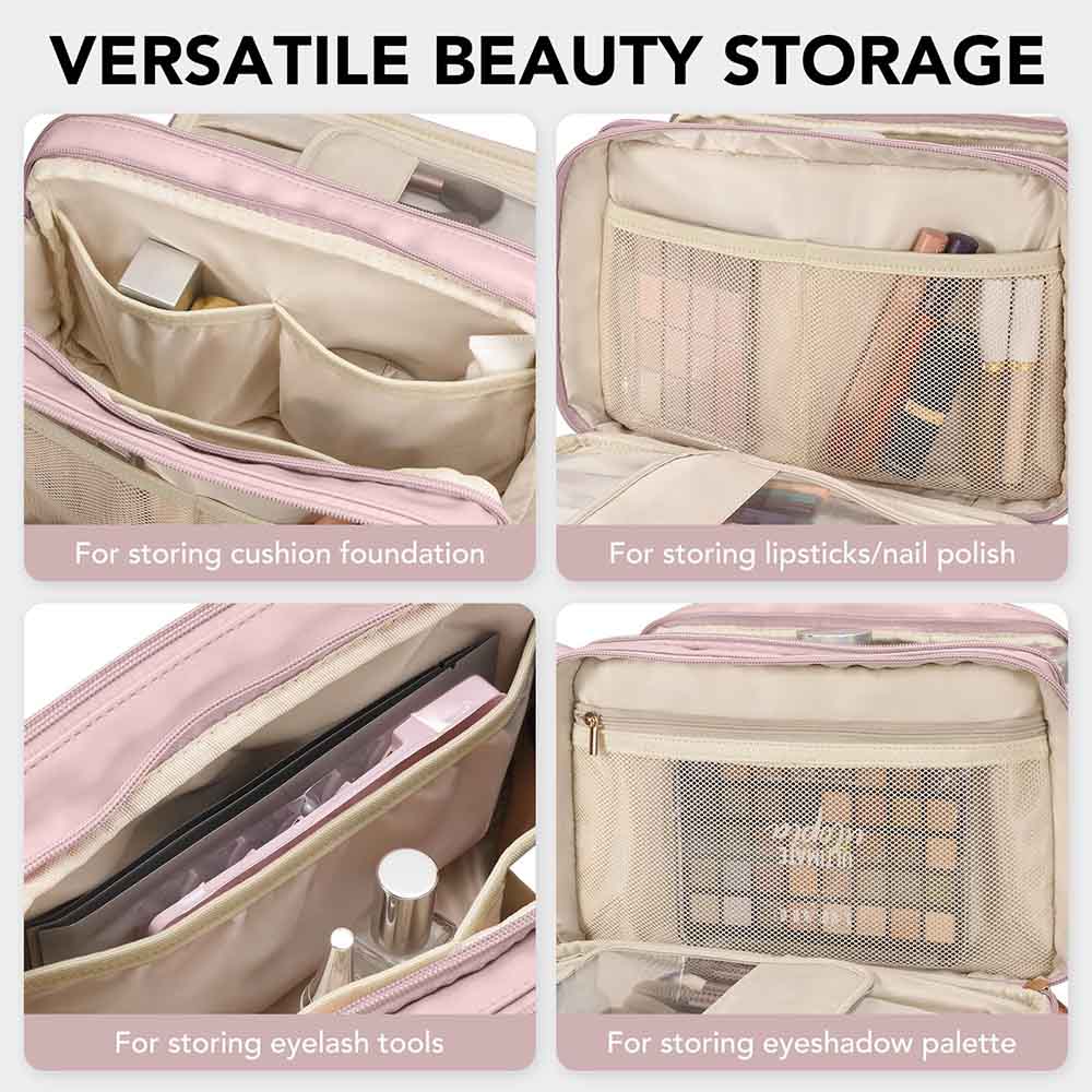 The main bag storage layer boasts 4 partitions including side double pockets for smaller items like lipstick, inner double pockets for thin items, and a middle section perfectly sized for holding tall bottles of lotion up to 400ml.