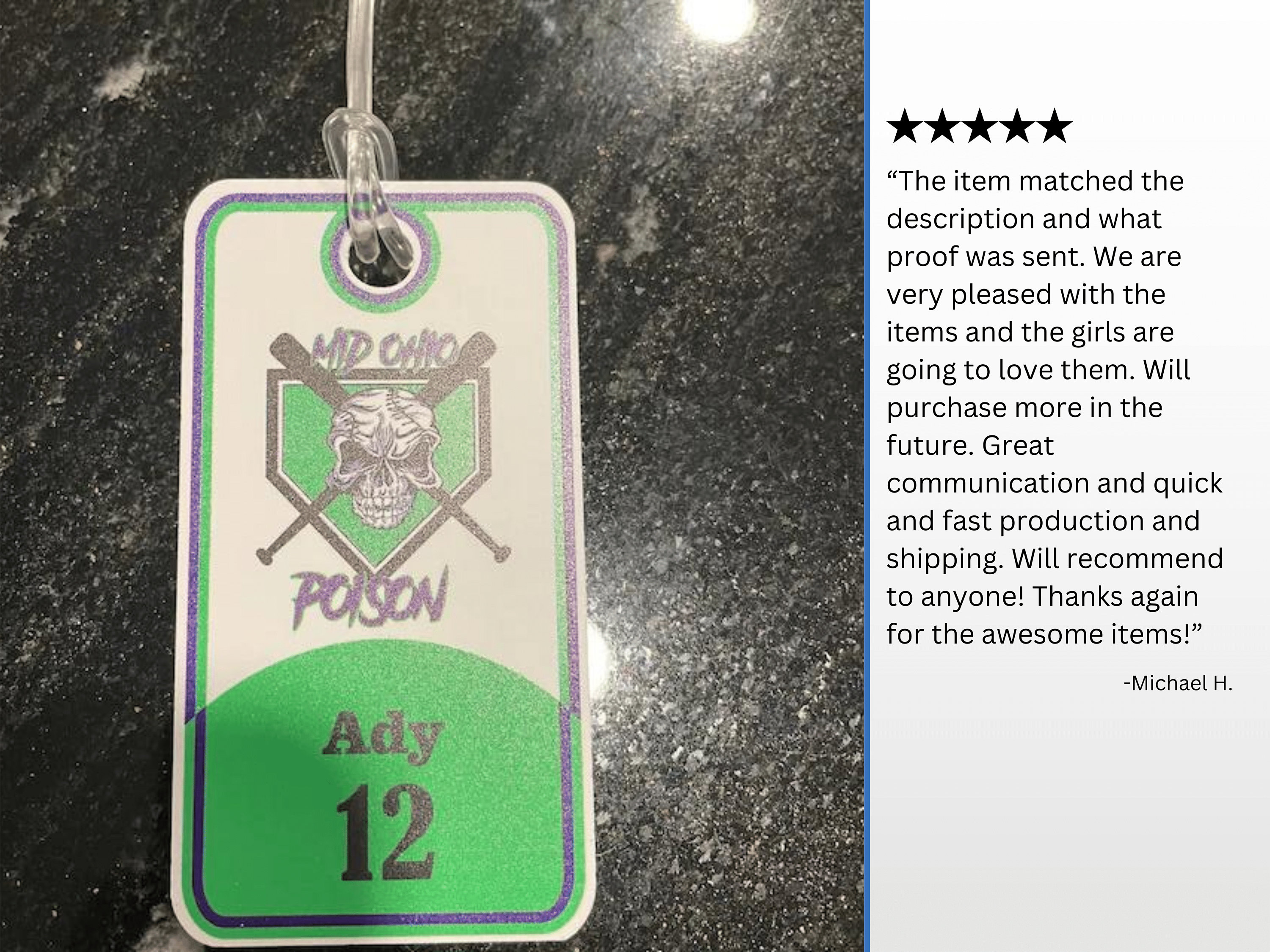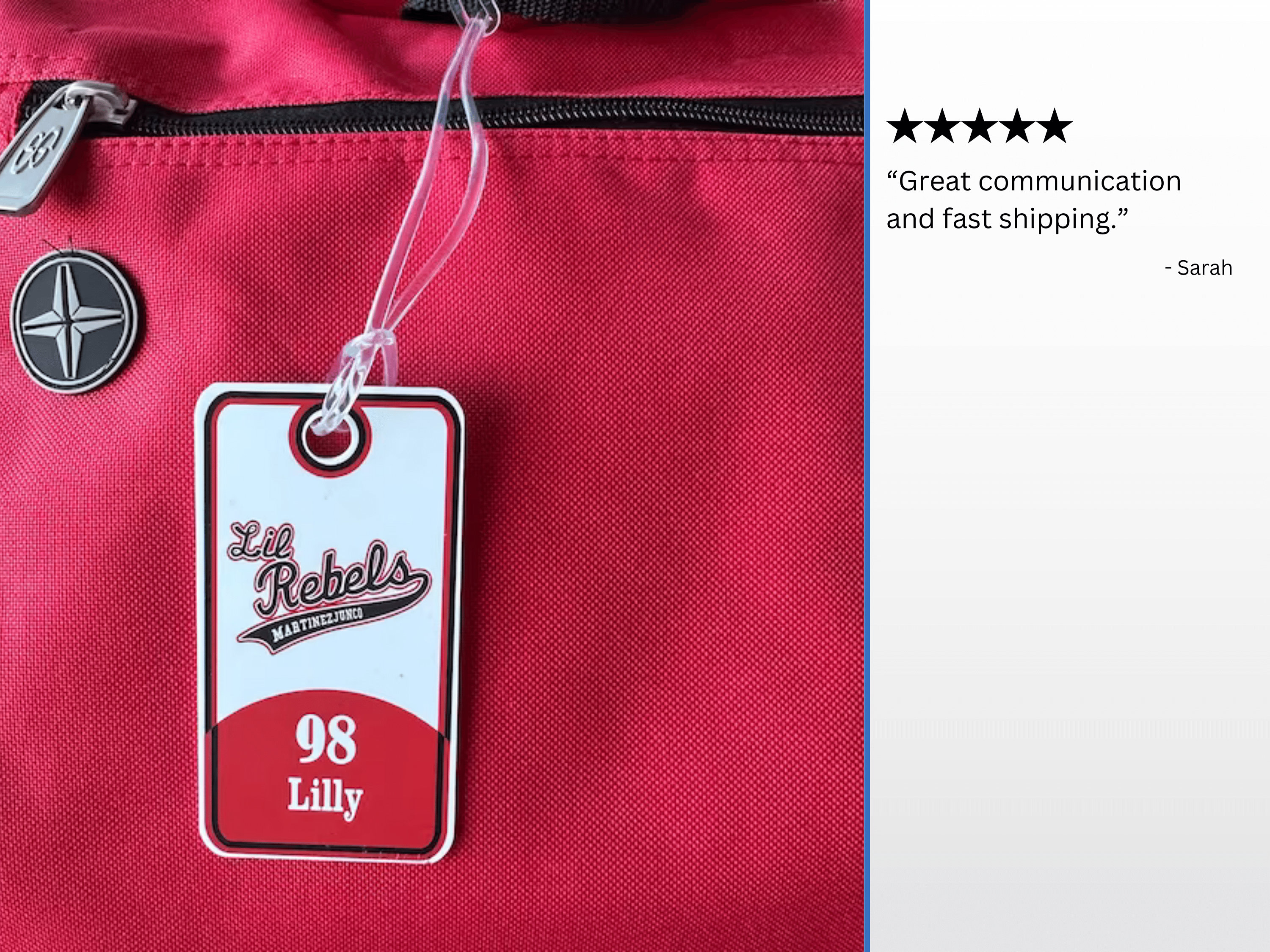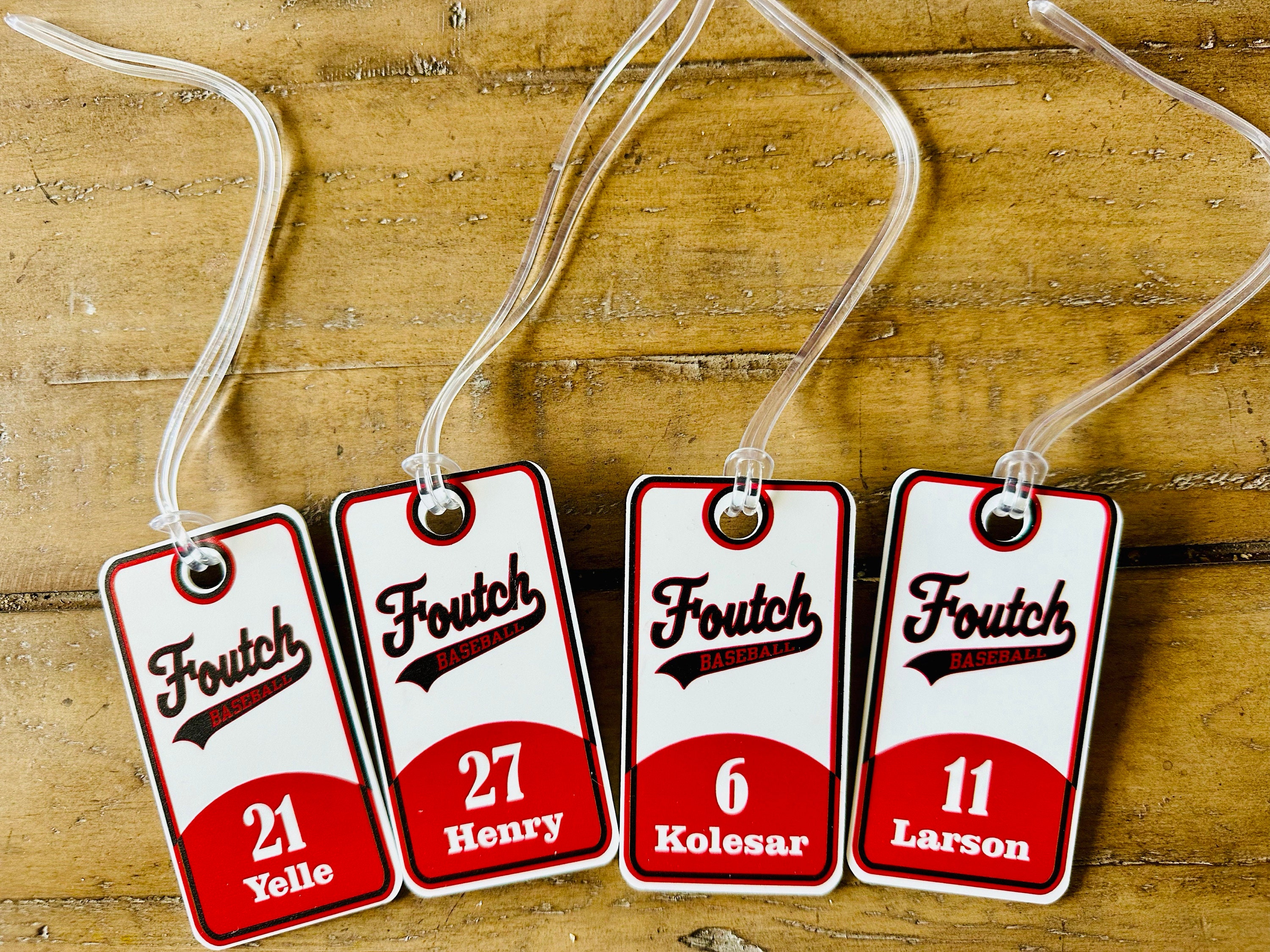 Our sports team bag tags come customized with your logo, colors, and names + a lanyard to attach to your bag. These bag tags are made for football, hockey, baseball, soccer, basketball, lacrosse, netball, softball, track and field etc and are made of heavy-duty plastic that is tough and durable and are built to last. Keep track of your gear.