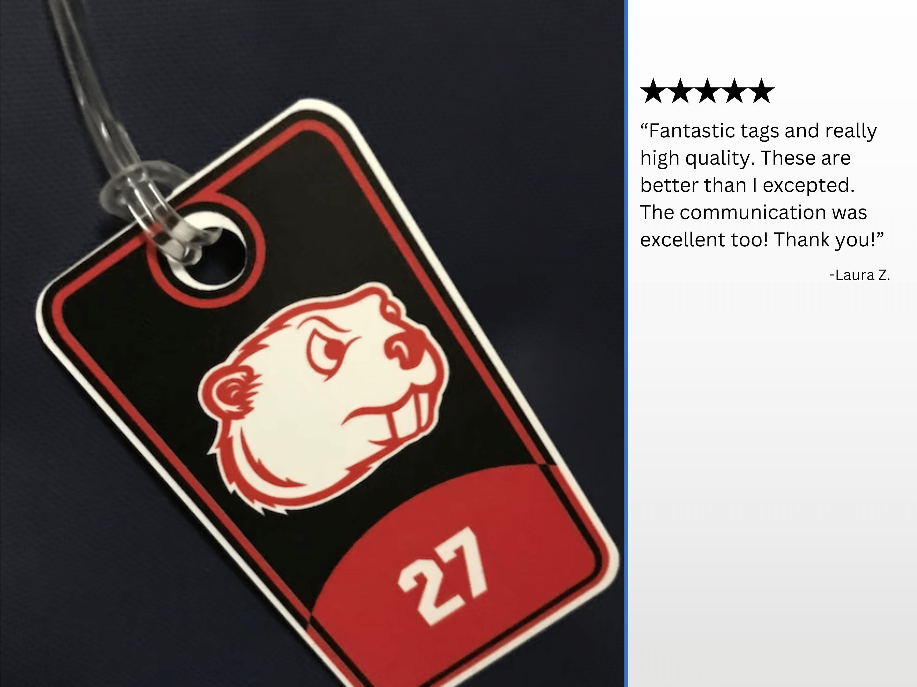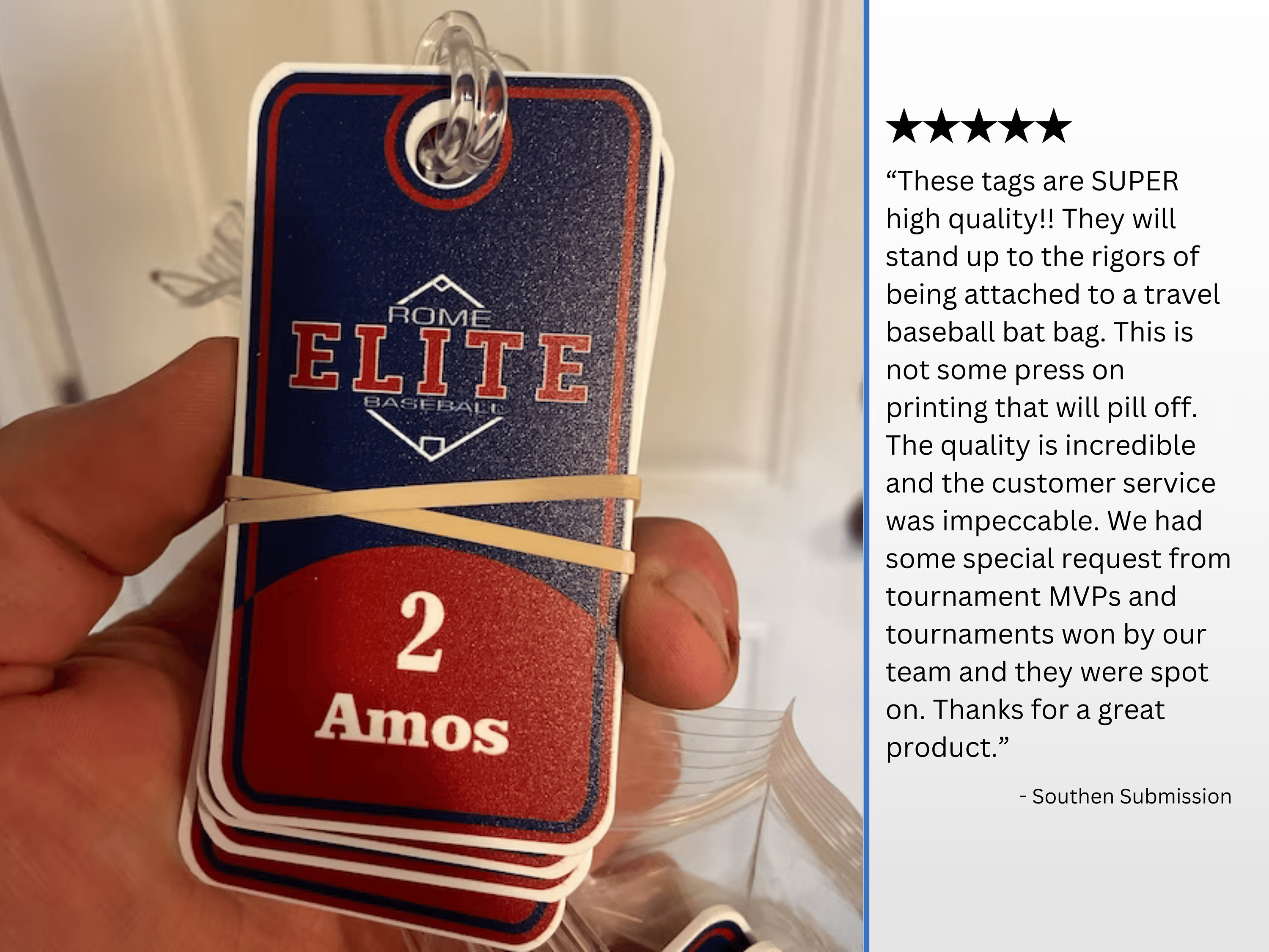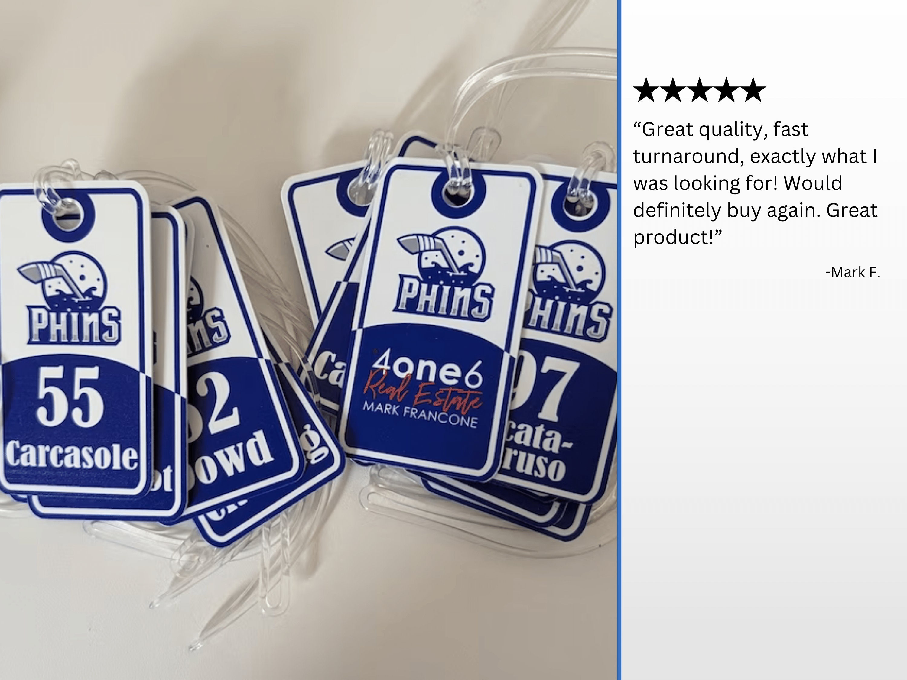Our sports team bag tags come customized with your logo, colors, and names + a lanyard to attach to your bag. These bag tags are made for football, hockey, baseball, soccer, basketball, lacrosse, netball, softball, track and field etc and are made of heavy-duty plastic that is tough and durable and are built to last. Keep track of your gear.
