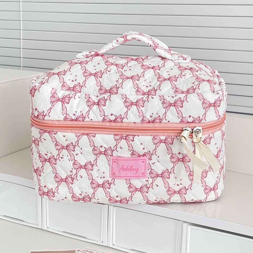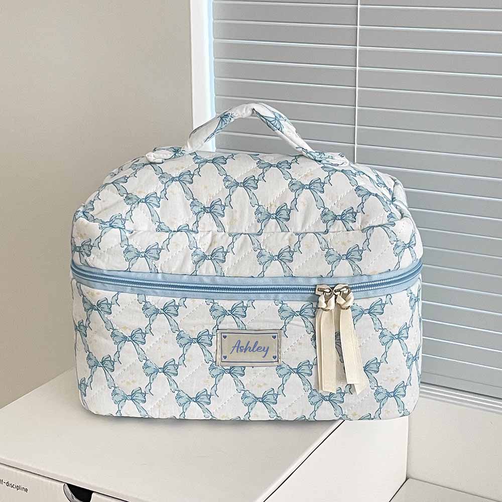 Quilted Floral Makeup Bag-- A vintage quilted handmade cute makeup bag featuring a gingham inner lining and outer quilting, distinctive pattern design and color matching, original and always popular, ideal for carrying and using during your travelsPortable and large capacity.It is easy to store small items, makeup brush, etc, to make your daily make-up, eyebrows, eyeliner, cream, lipstick, perfume and other beauty things organized and protected.