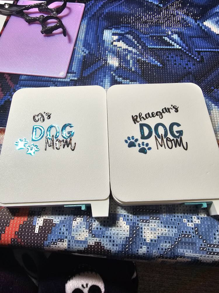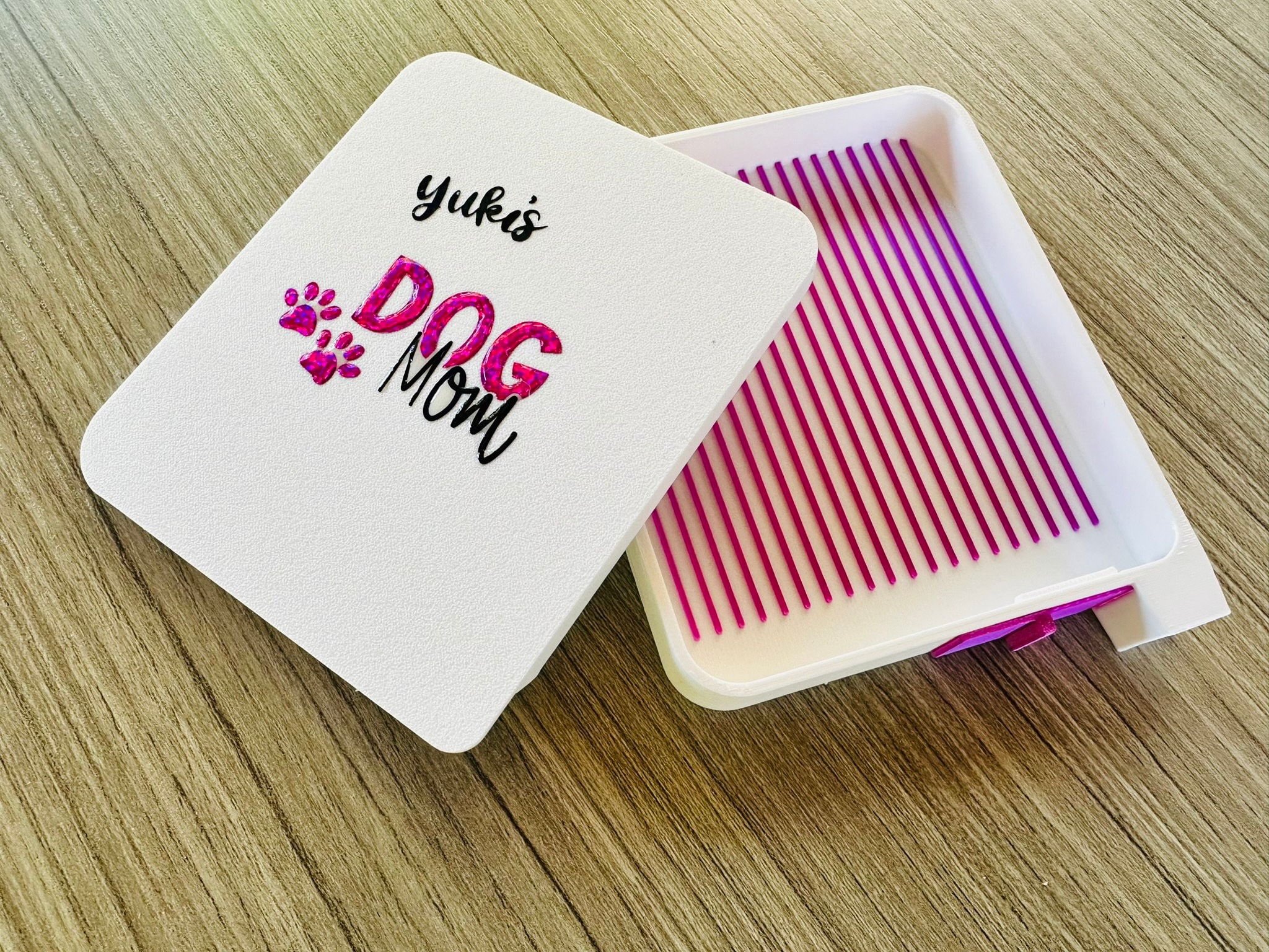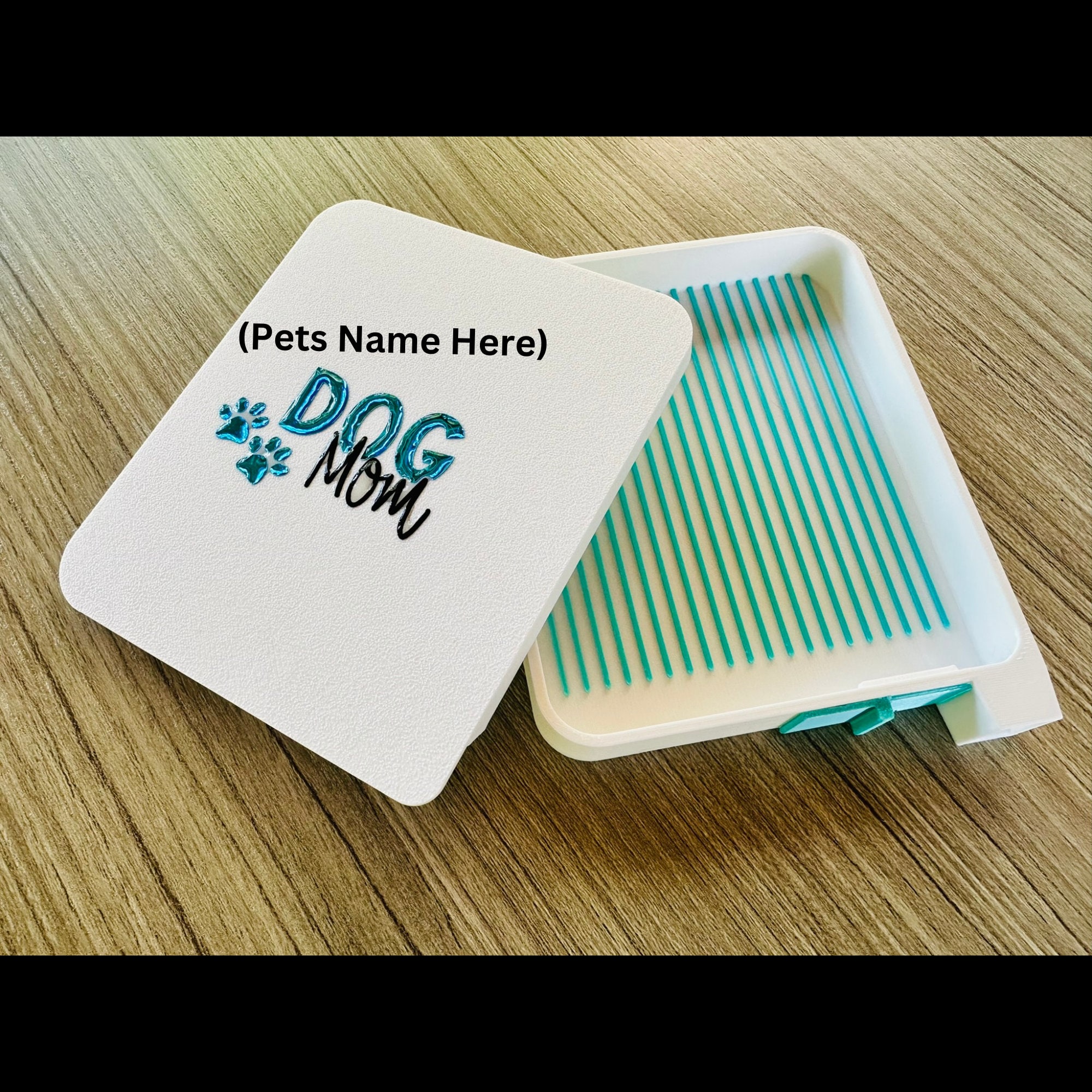 For personalization please choose appropriate listing and tell me your dog's name to be added to your tray! Personalization comes in one font (script/cursive) and one color (holographic black) for this listing.