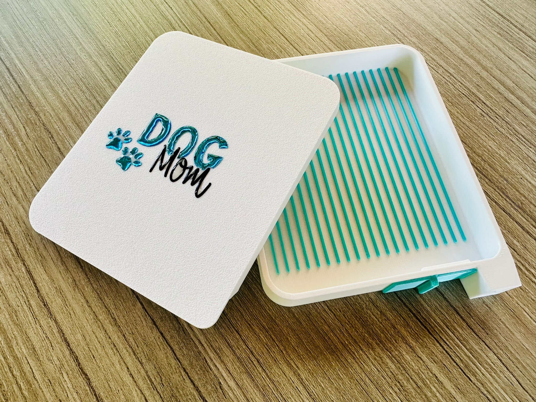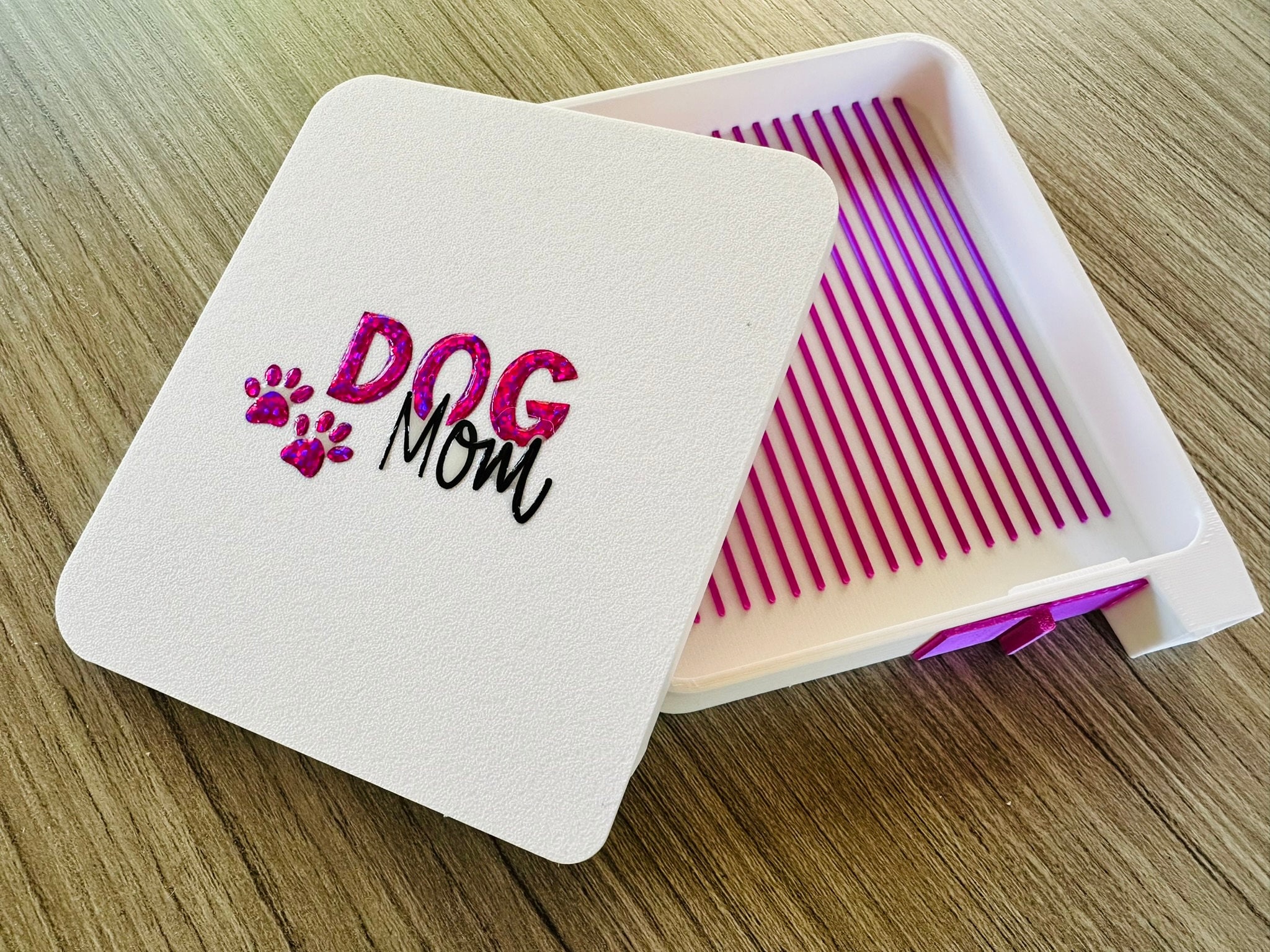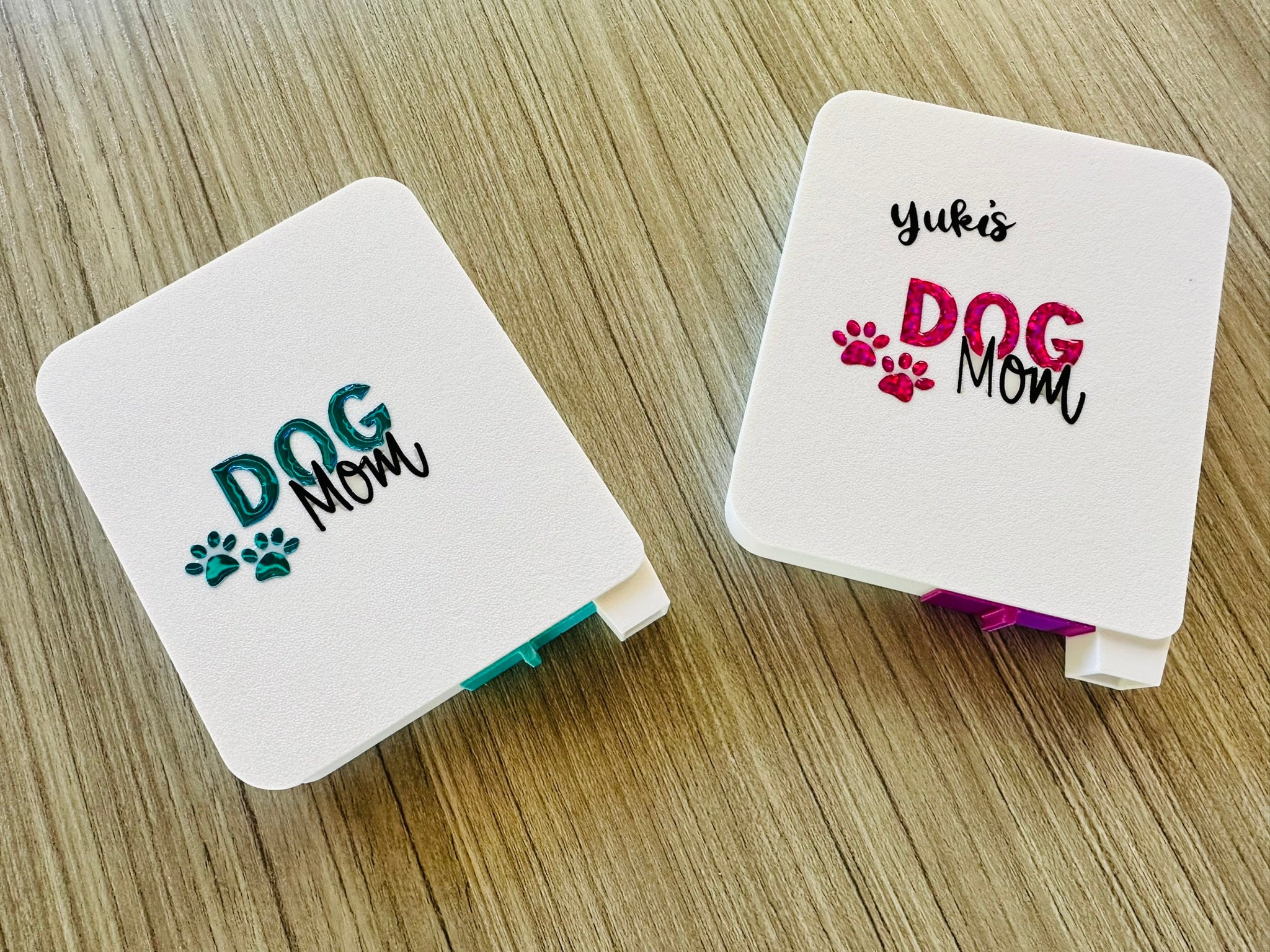 For personalization please choose appropriate listing and tell me your dog's name to be added to your tray! Personalization comes in one font (script/cursive) and one color (holographic black) for this listing.