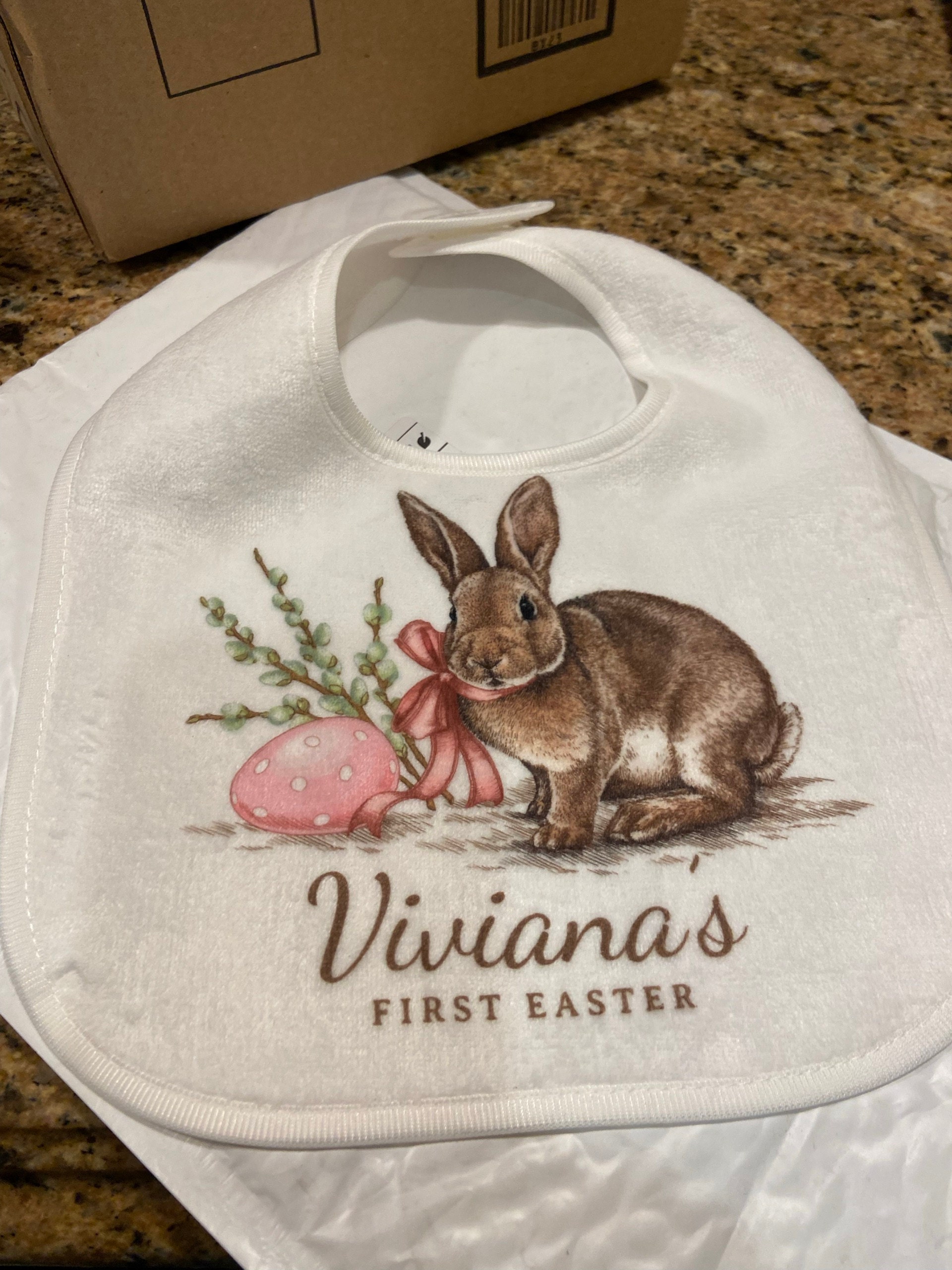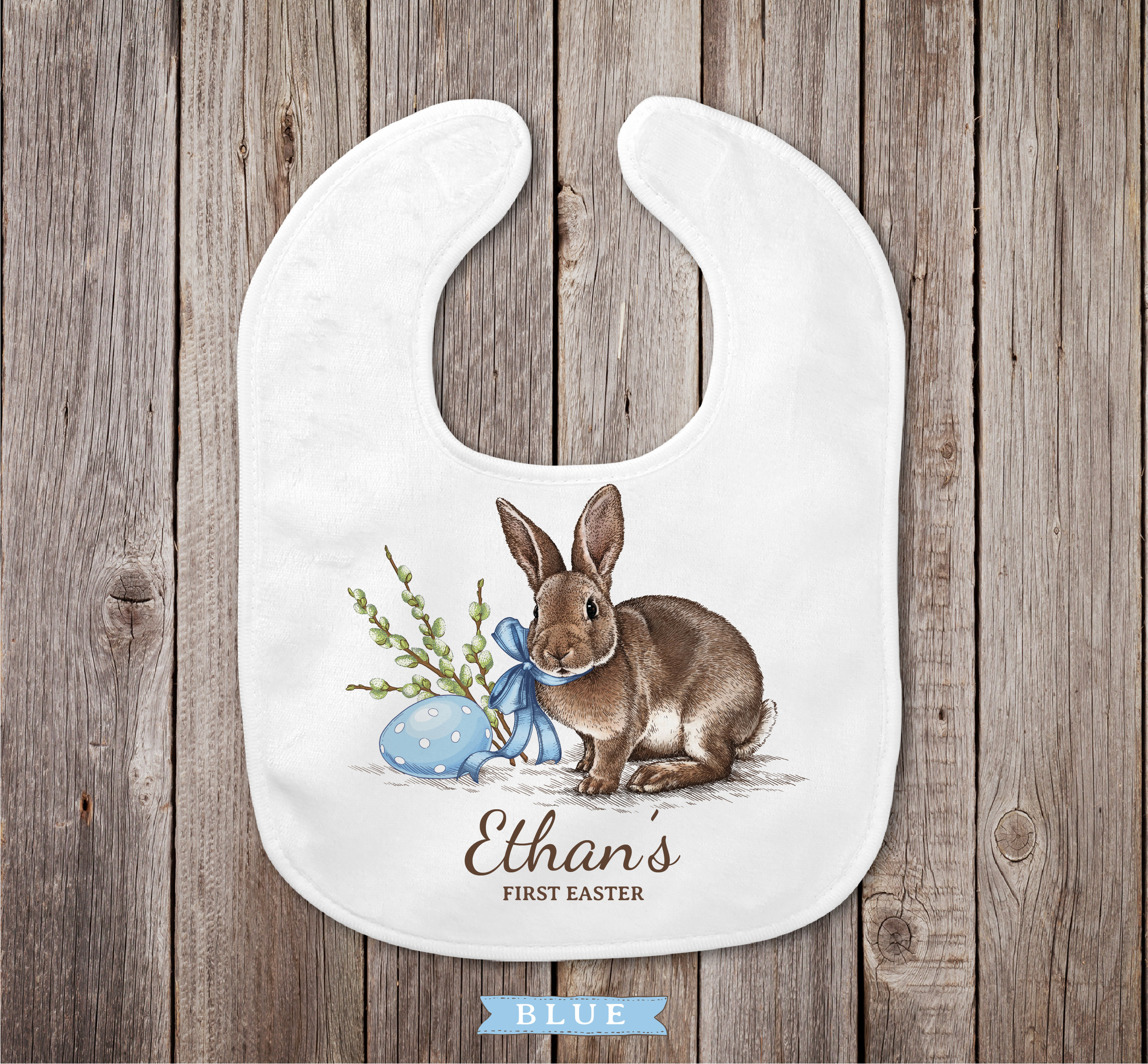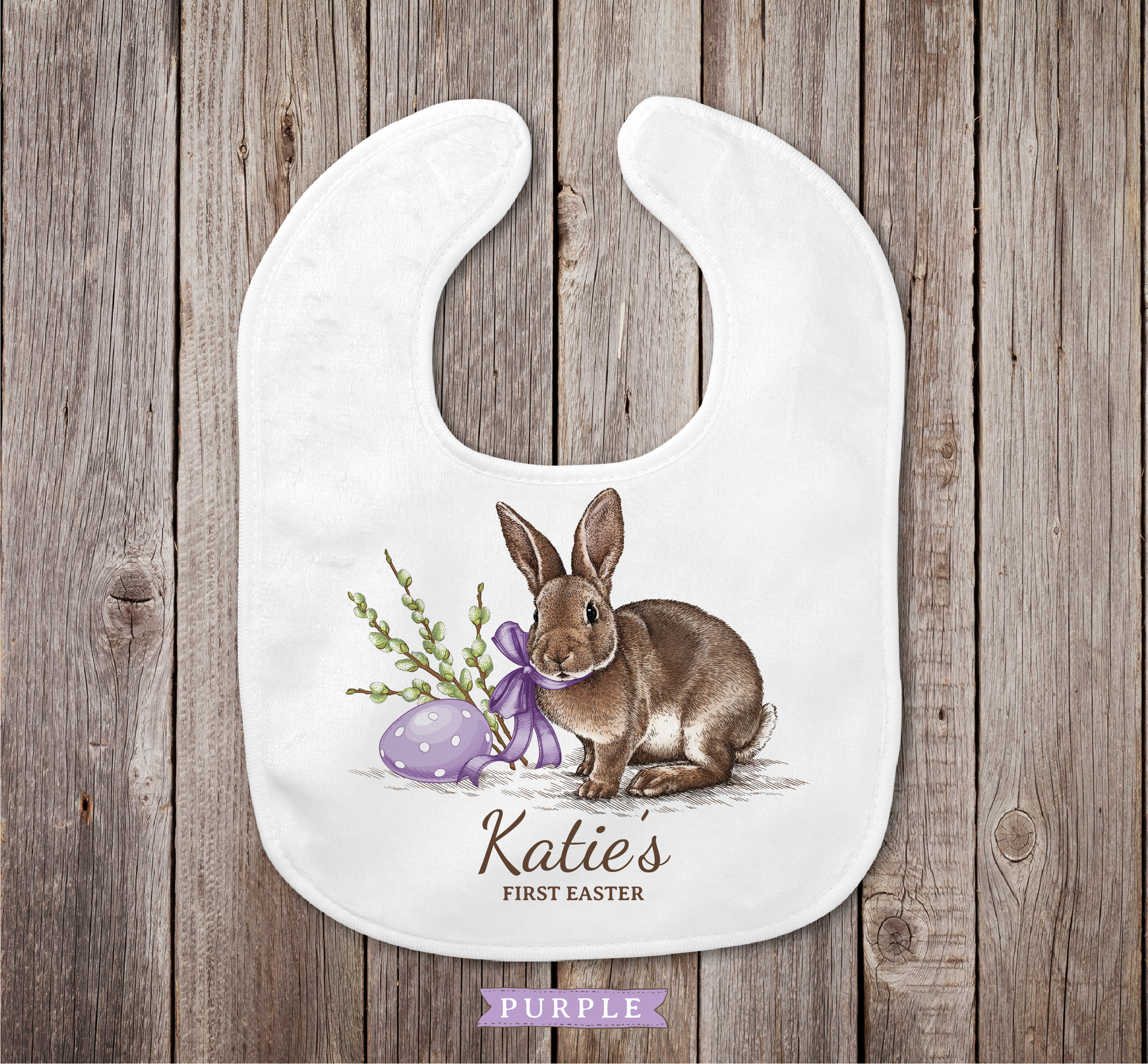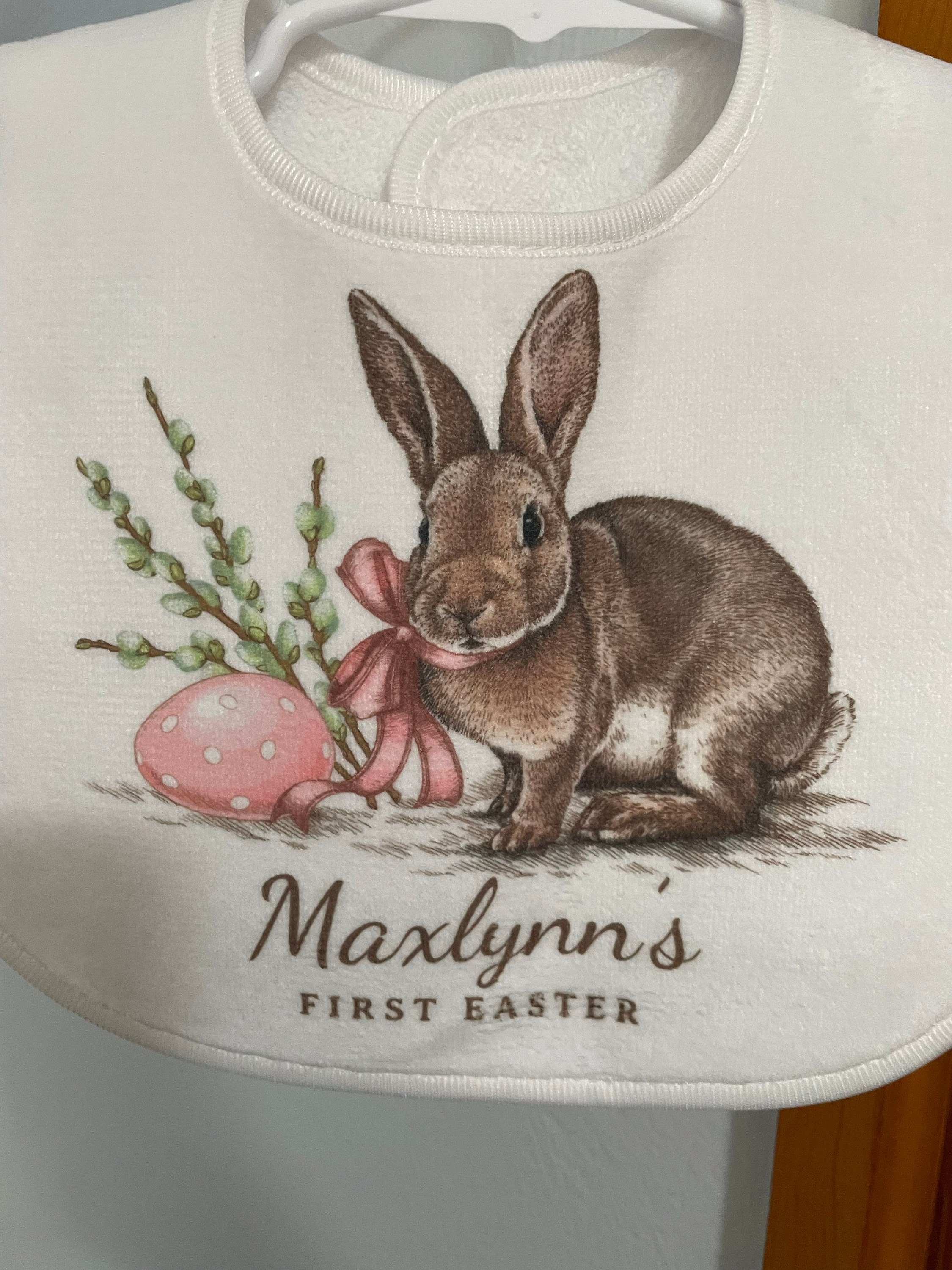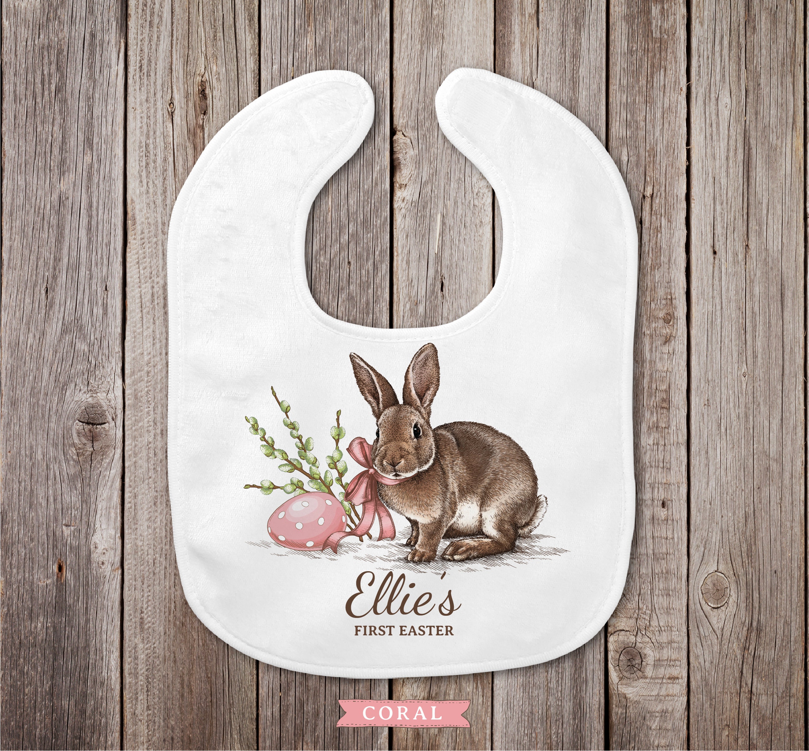 This cute bib is personalized with a name and the words "First Easter". It features an easter bunny next to pink easter eggs.