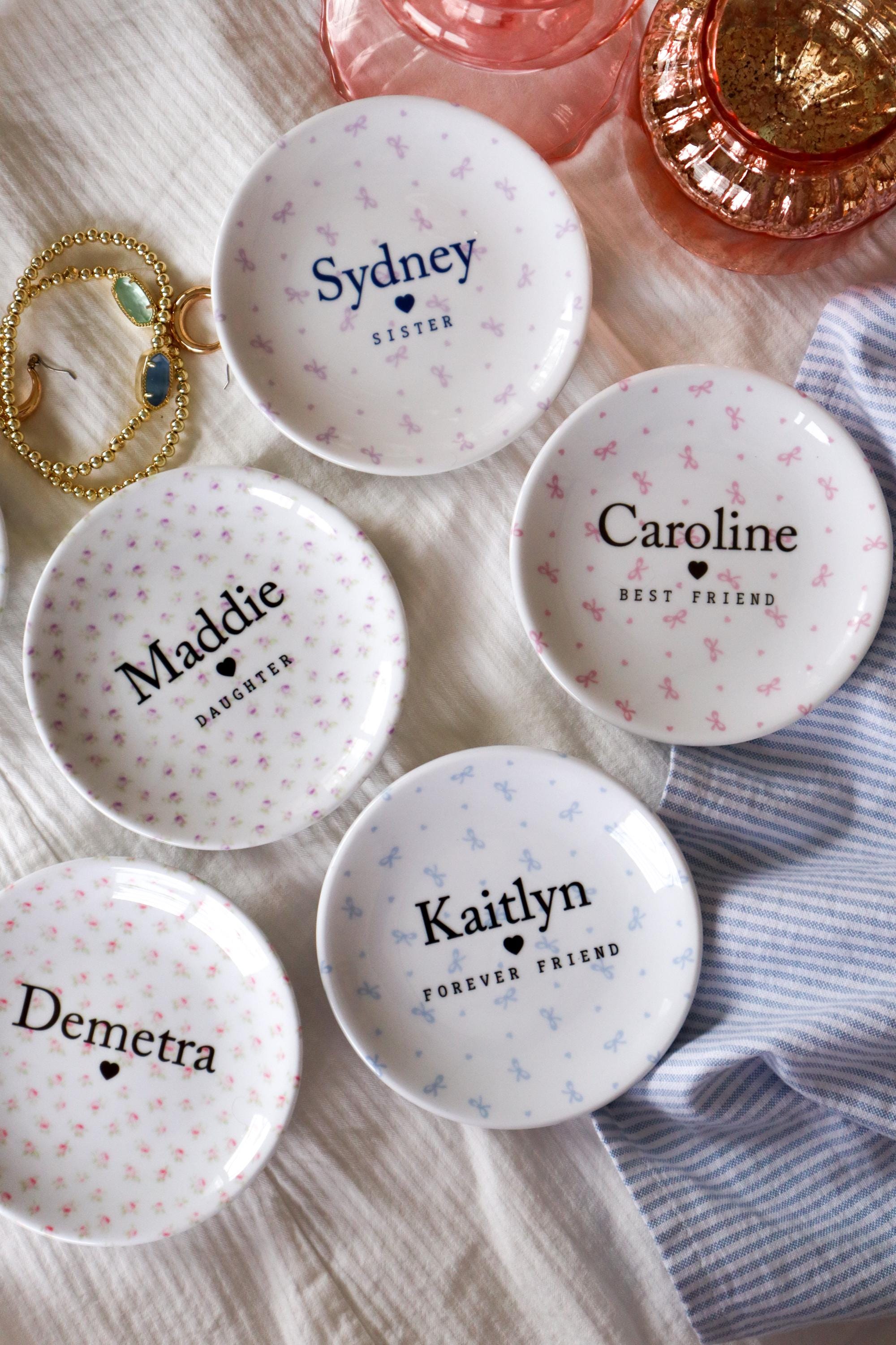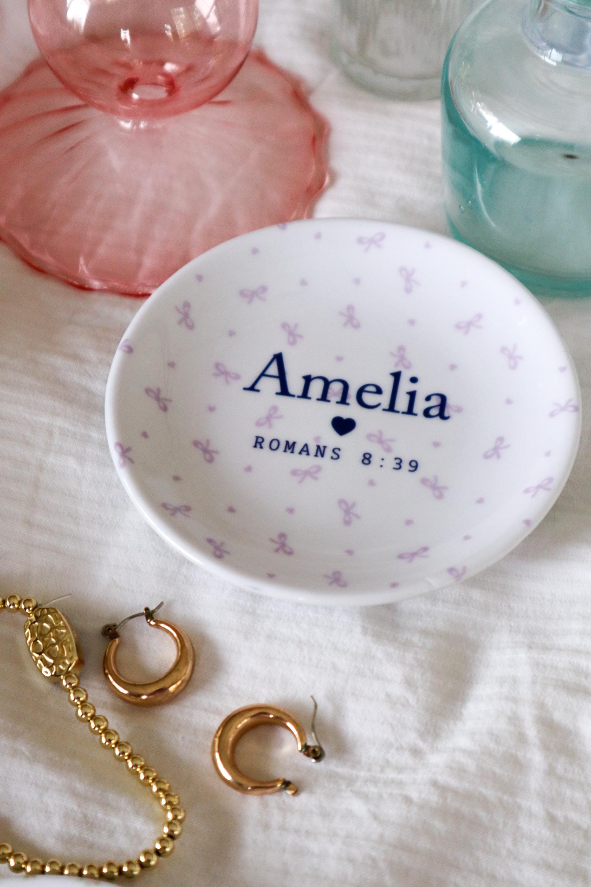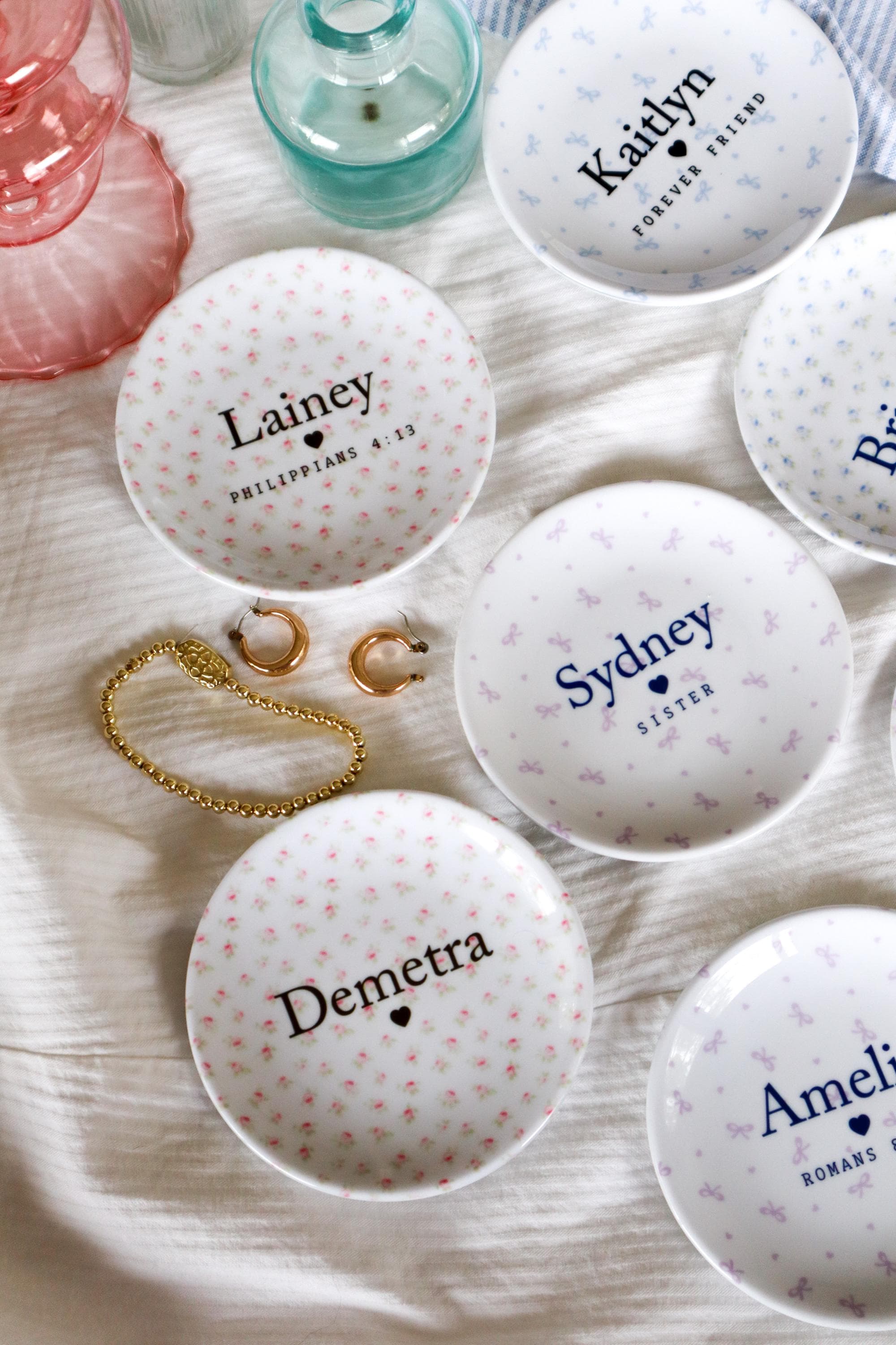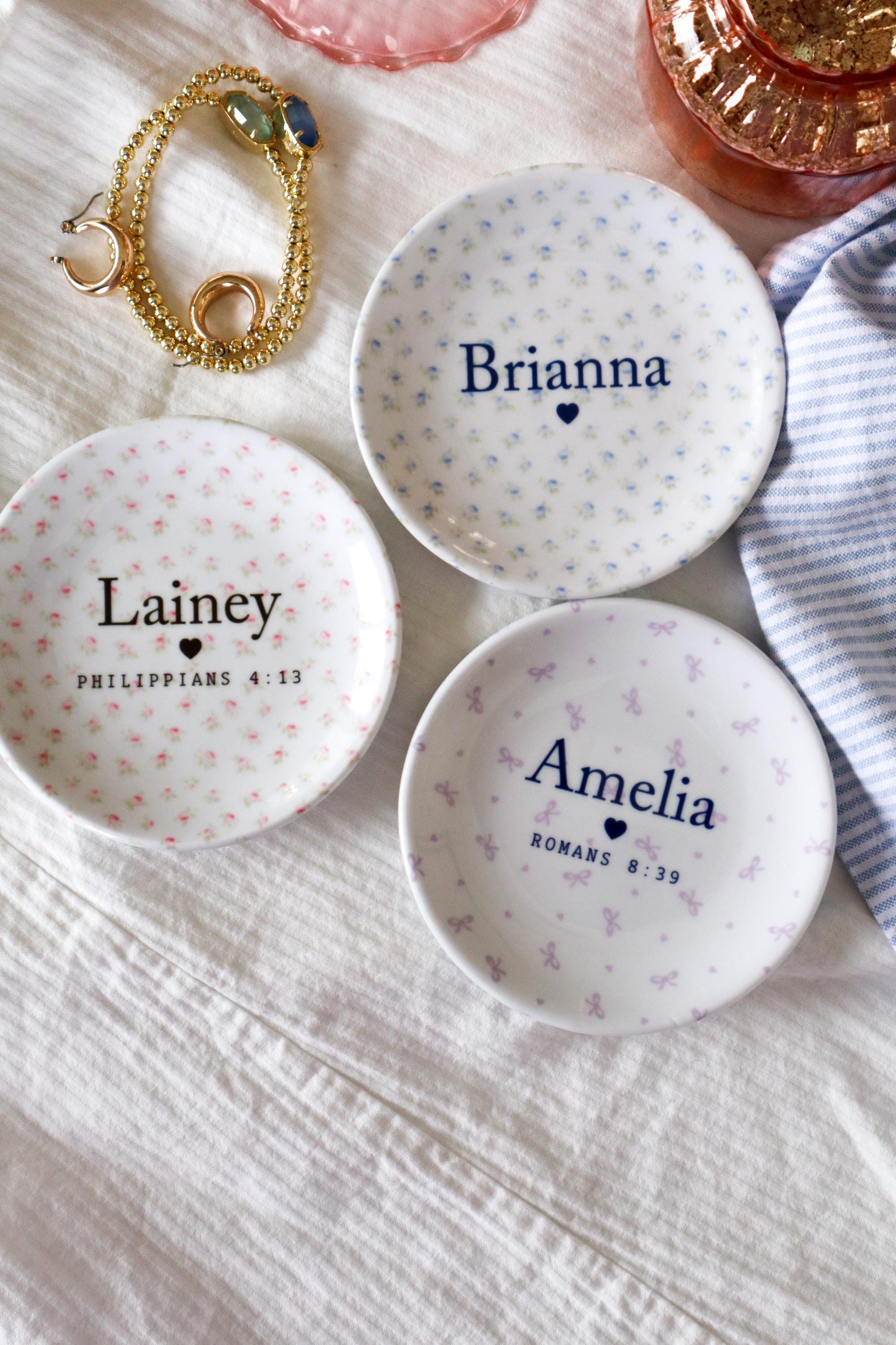 Personalized dainty ring dishes are the perfect best friend or gift for her. Add your own meaningful Bible verse. Our ceramic jewelry dishes are super high quality and will become an instant heirloom. Personalize your dish with name and title, text color and pattern. Each dish is kiln fired in our Pennsylvania studio.