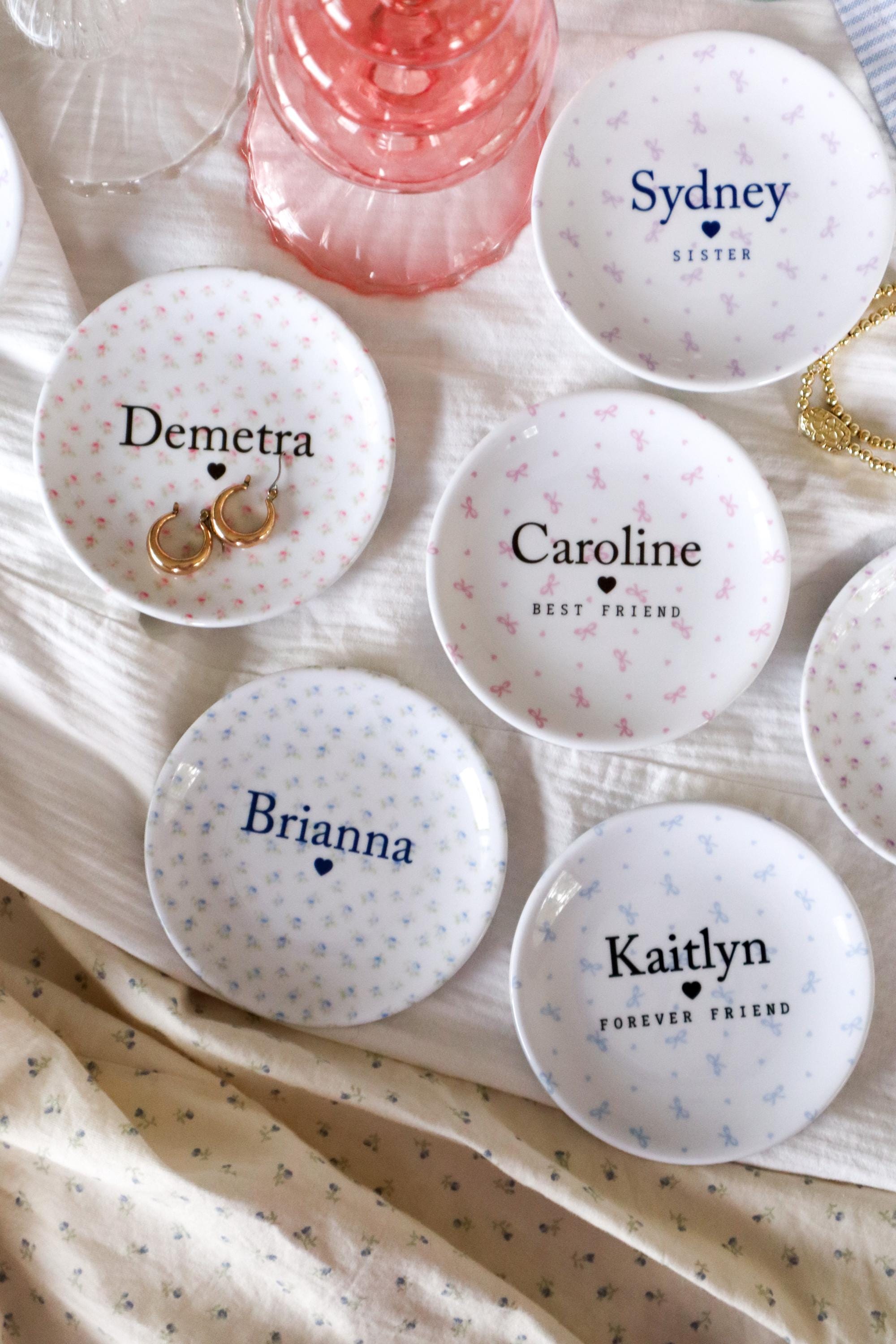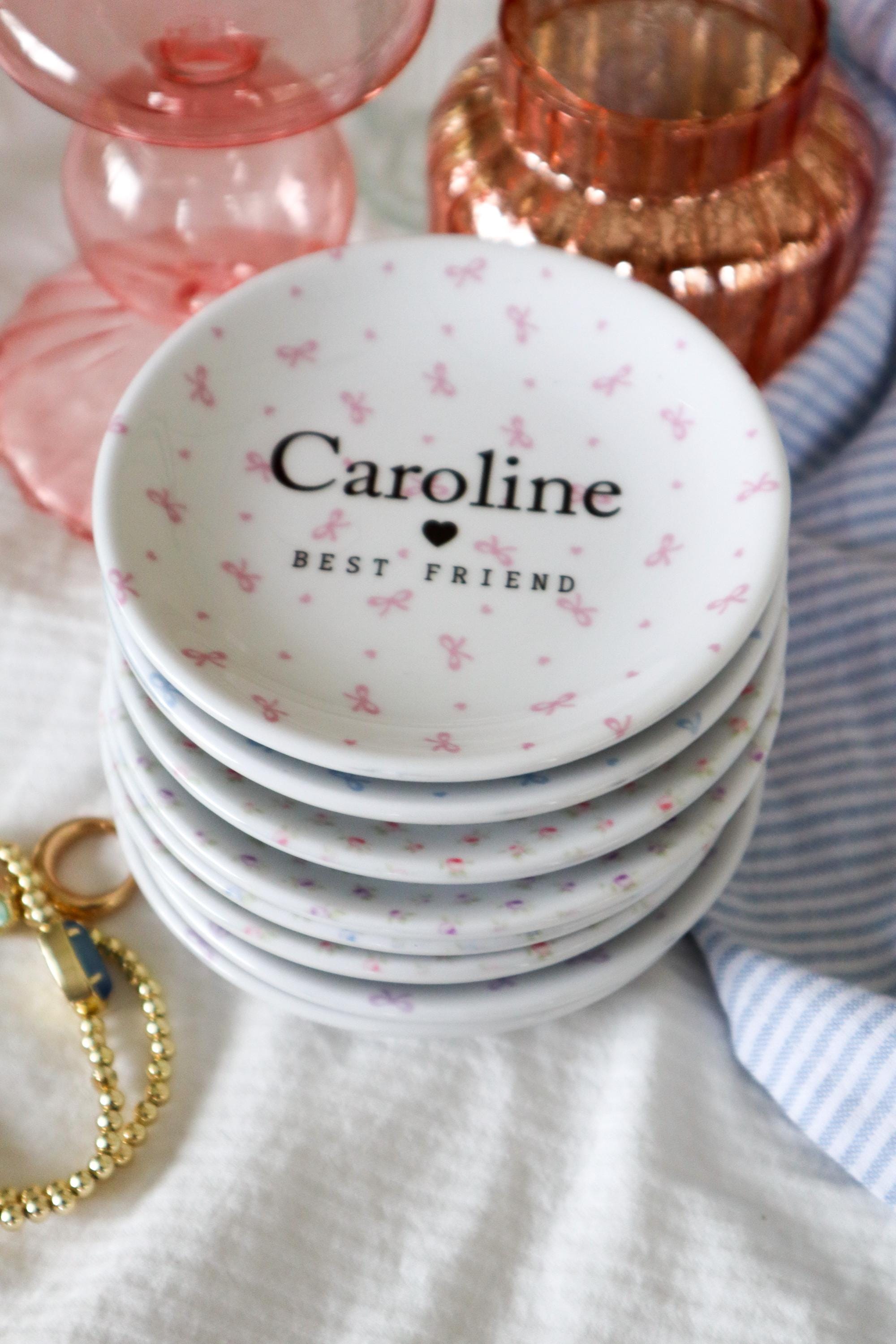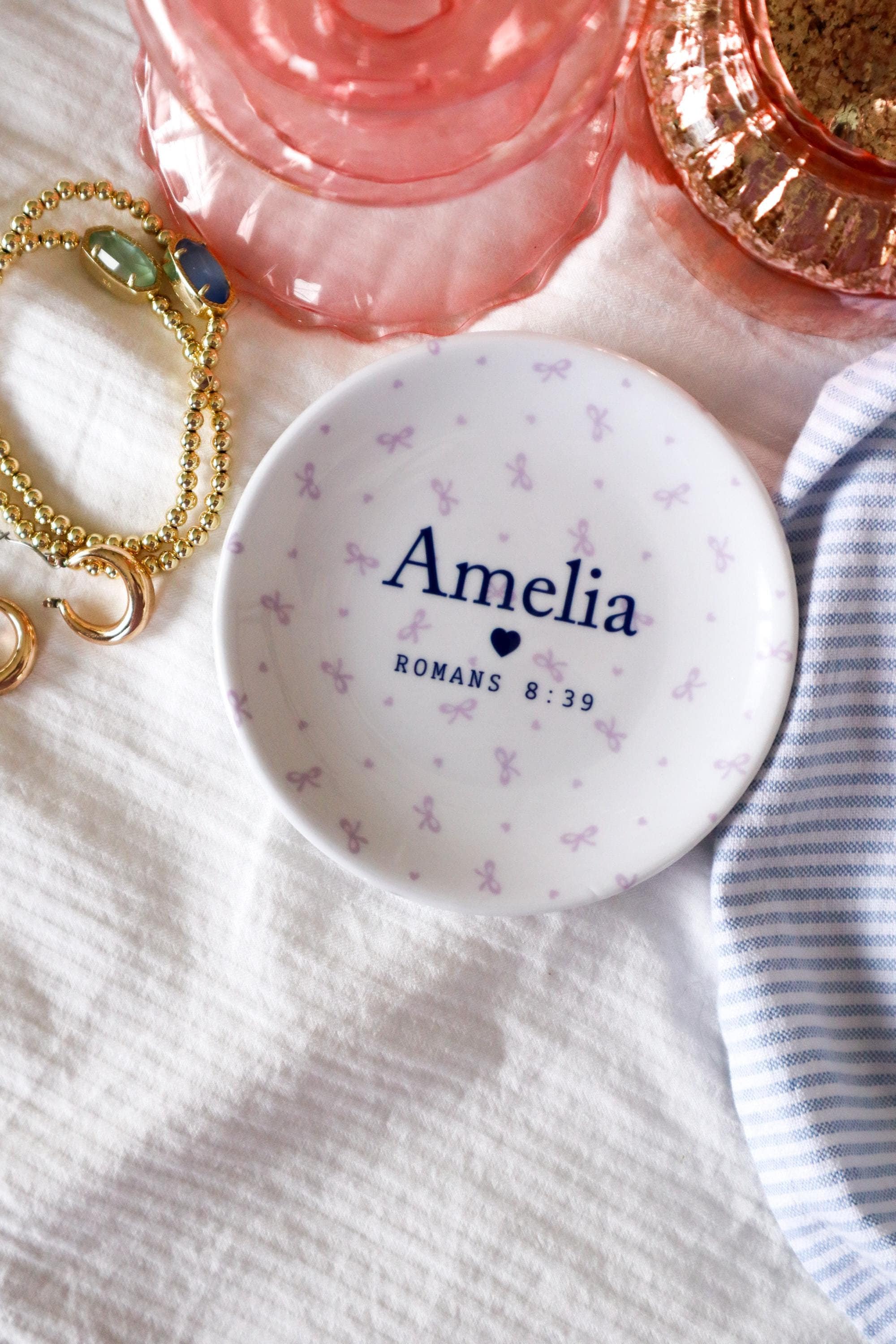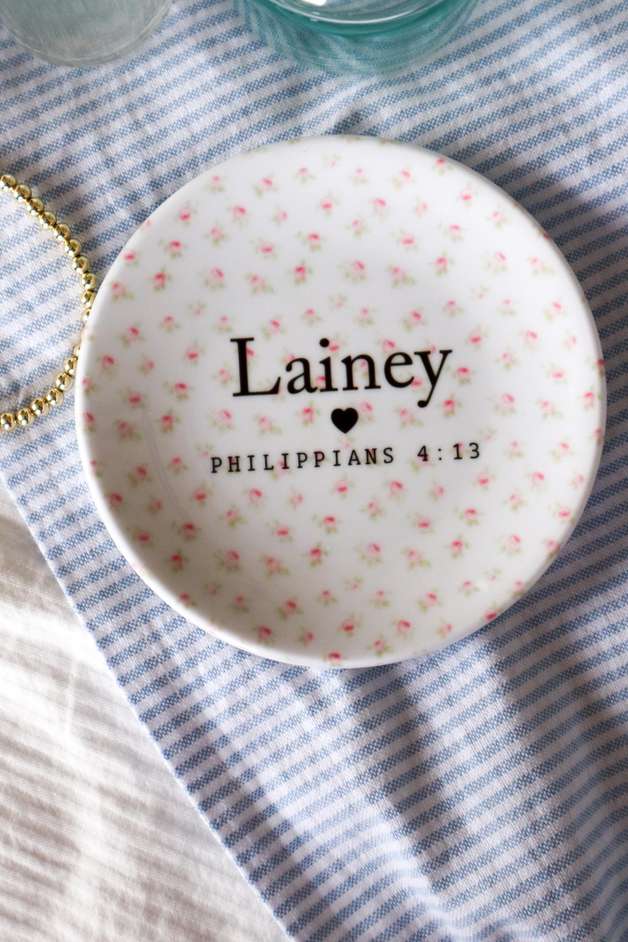 Personalized dainty ring dishes are the perfect best friend or gift for her. Add your own meaningful Bible verse. Our ceramic jewelry dishes are super high quality and will become an instant heirloom. Personalize your dish with name and title, text color and pattern. Each dish is kiln fired in our Pennsylvania studio.