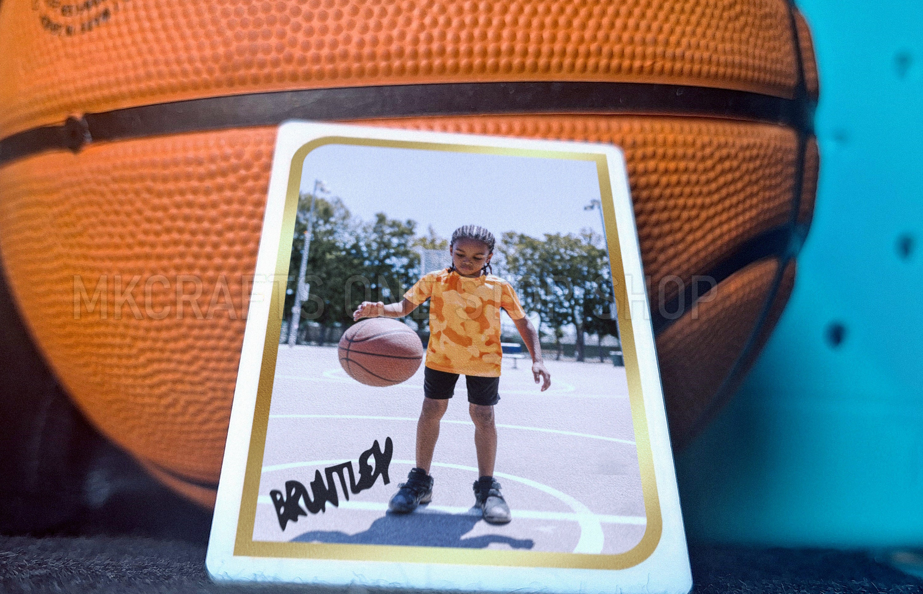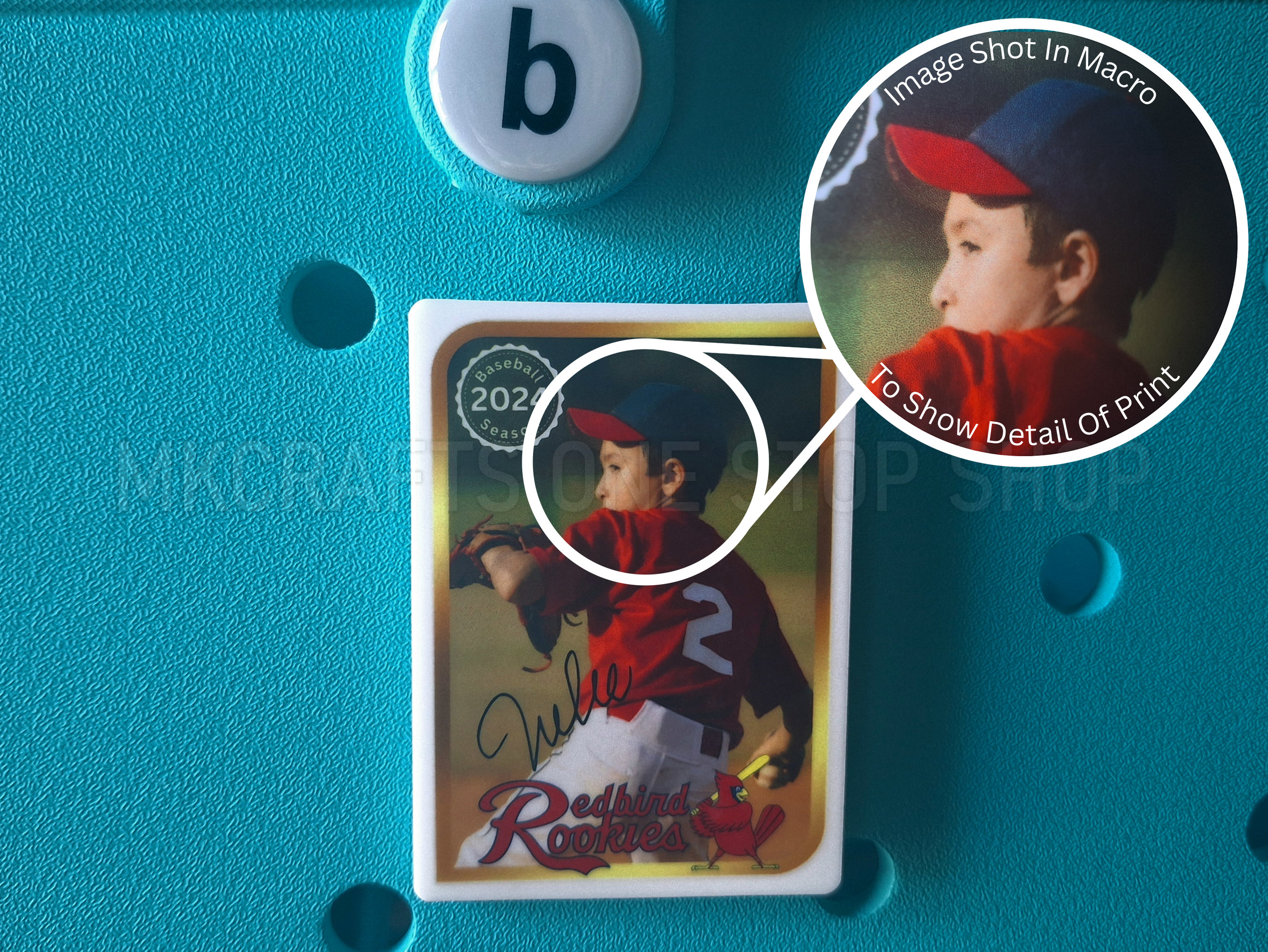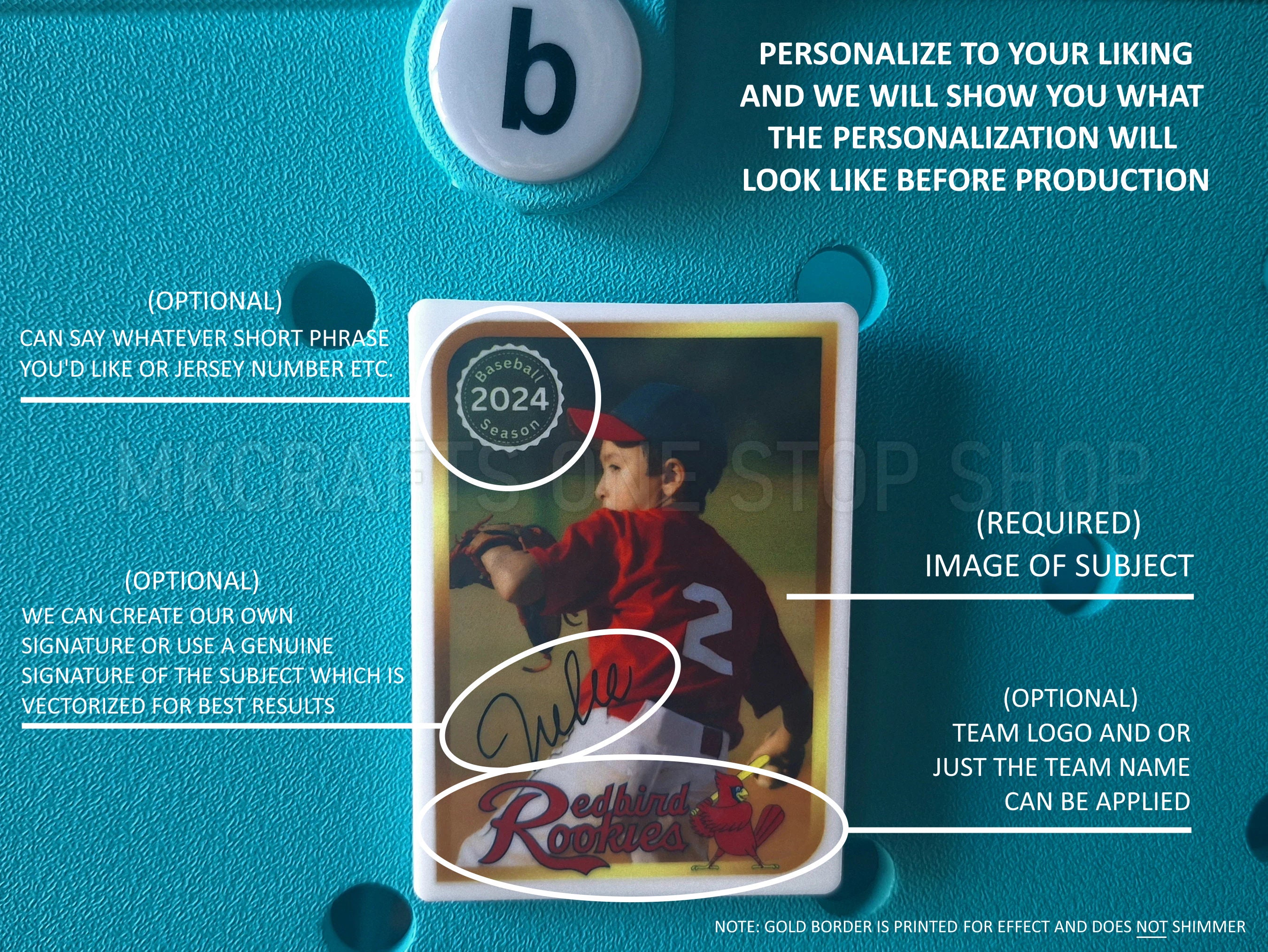 These sports card charms are 3.5" (8.89 cm) H printed on matte acrylic. The dimensions are compare able to real sports cards, and can be any sport we will just switch out the year and sport, cheer, team member etc. as per request to what you'd like! The signature is optional but a nice touch of cuteness and realism for your little superstar. Just send in a picture of the autograph and we will add it to the card in a random spot that looks good and authentic.If you have requests feel free to ask.