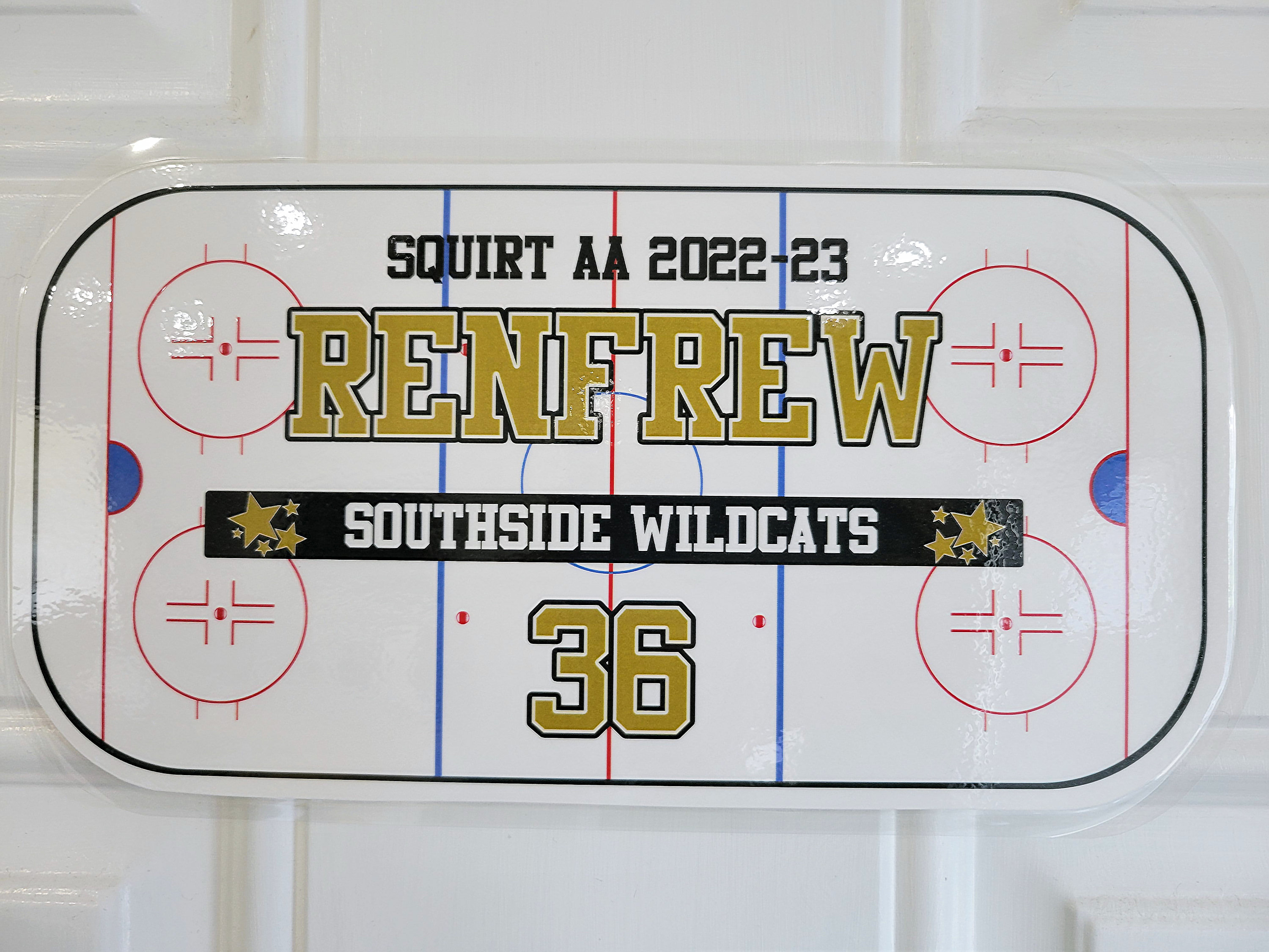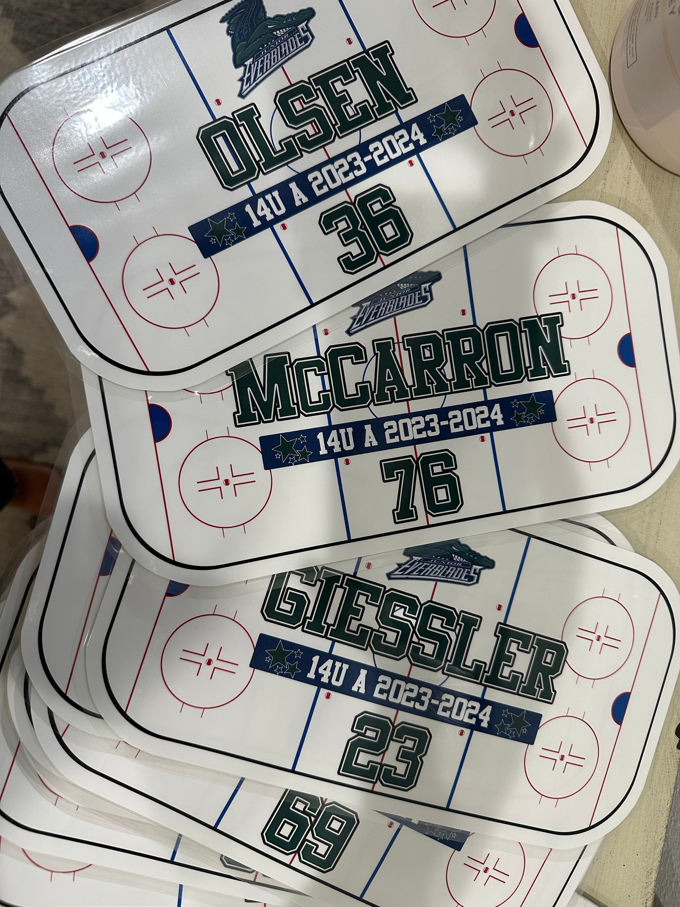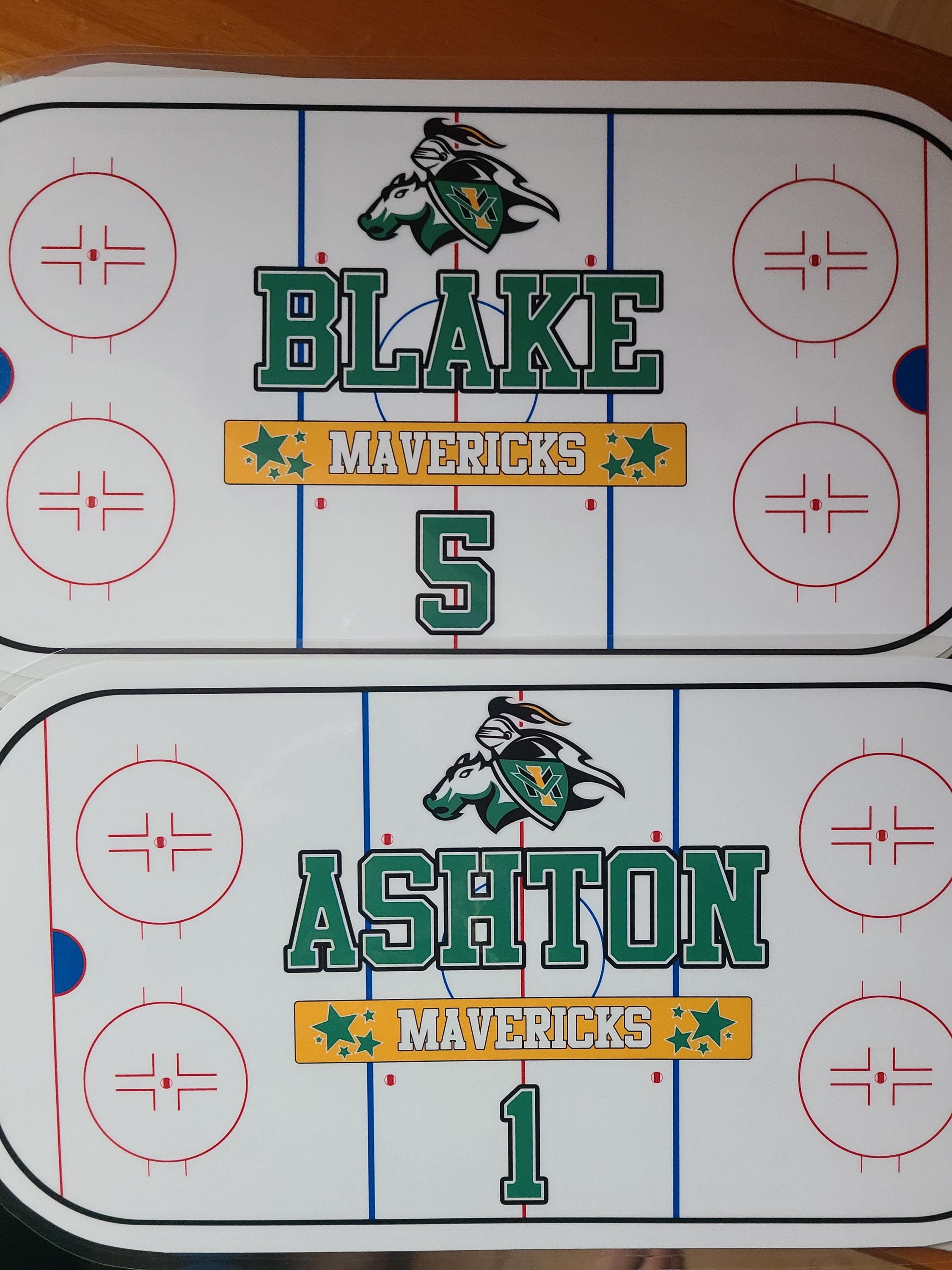 Hockey tournament door signs for the hotel. Help your players find each other's rooms and display team pride! Or use them in the locker room above each player's space. These work great as inexpensive bedroom door signs or room decor as well! Printed on cardstock paper and laminated. Poster putty is recommended for easy hanging and removal.