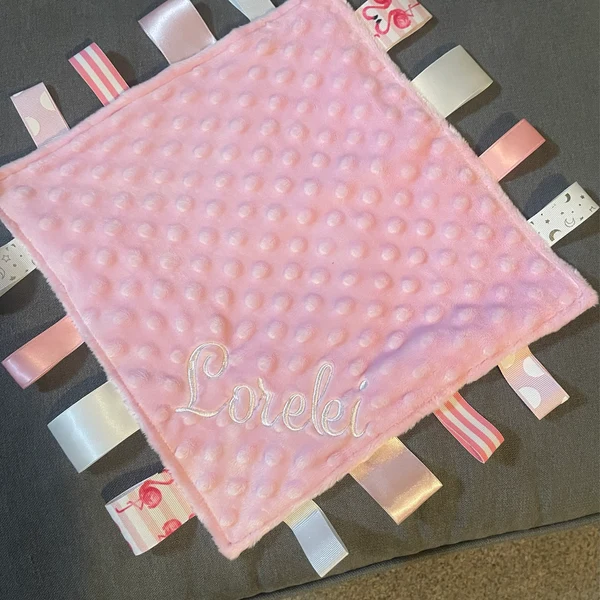This lovey measures approx 12” square (measurement doesn’t include ribbon length)