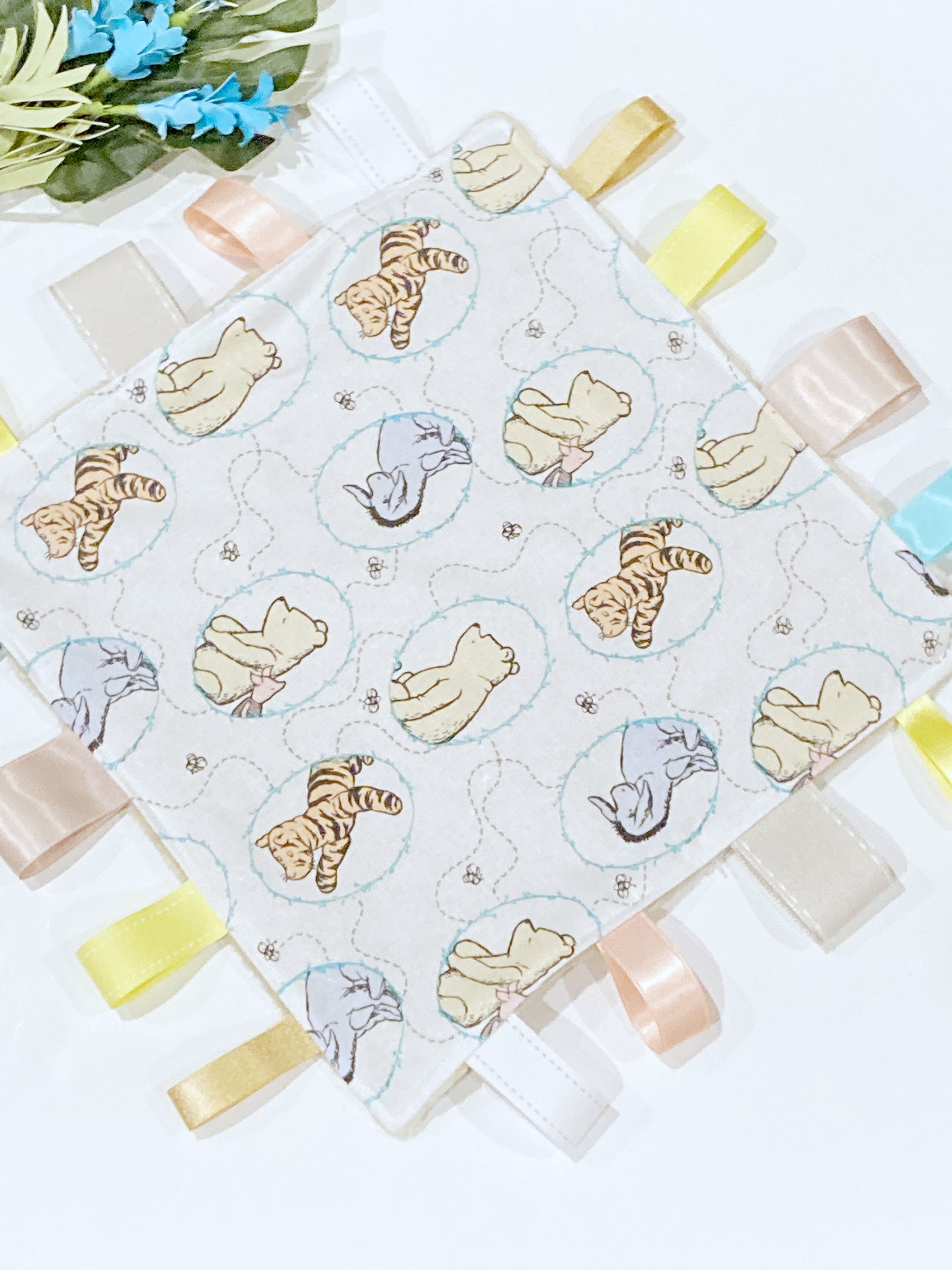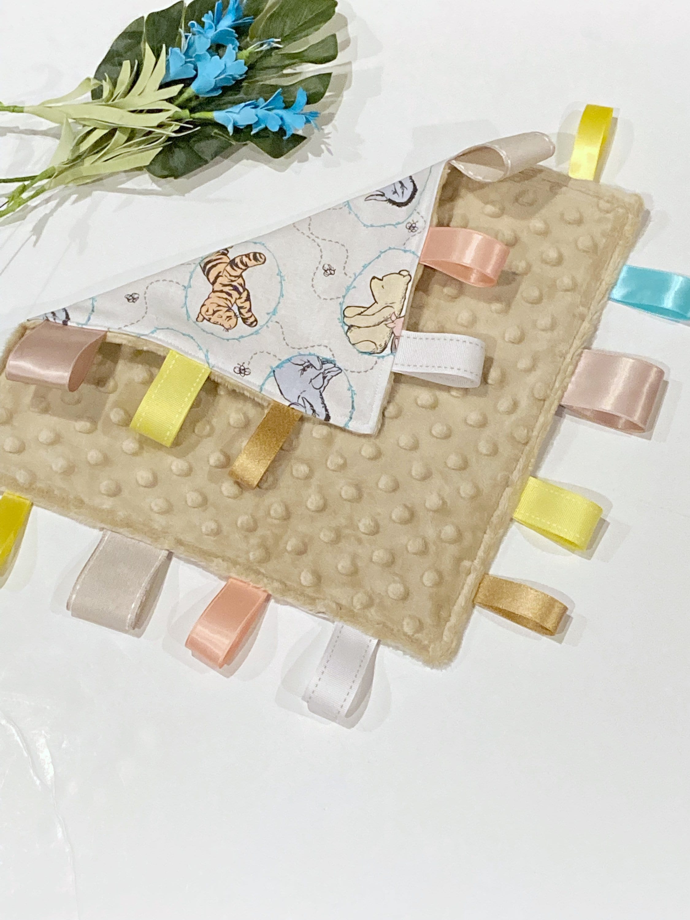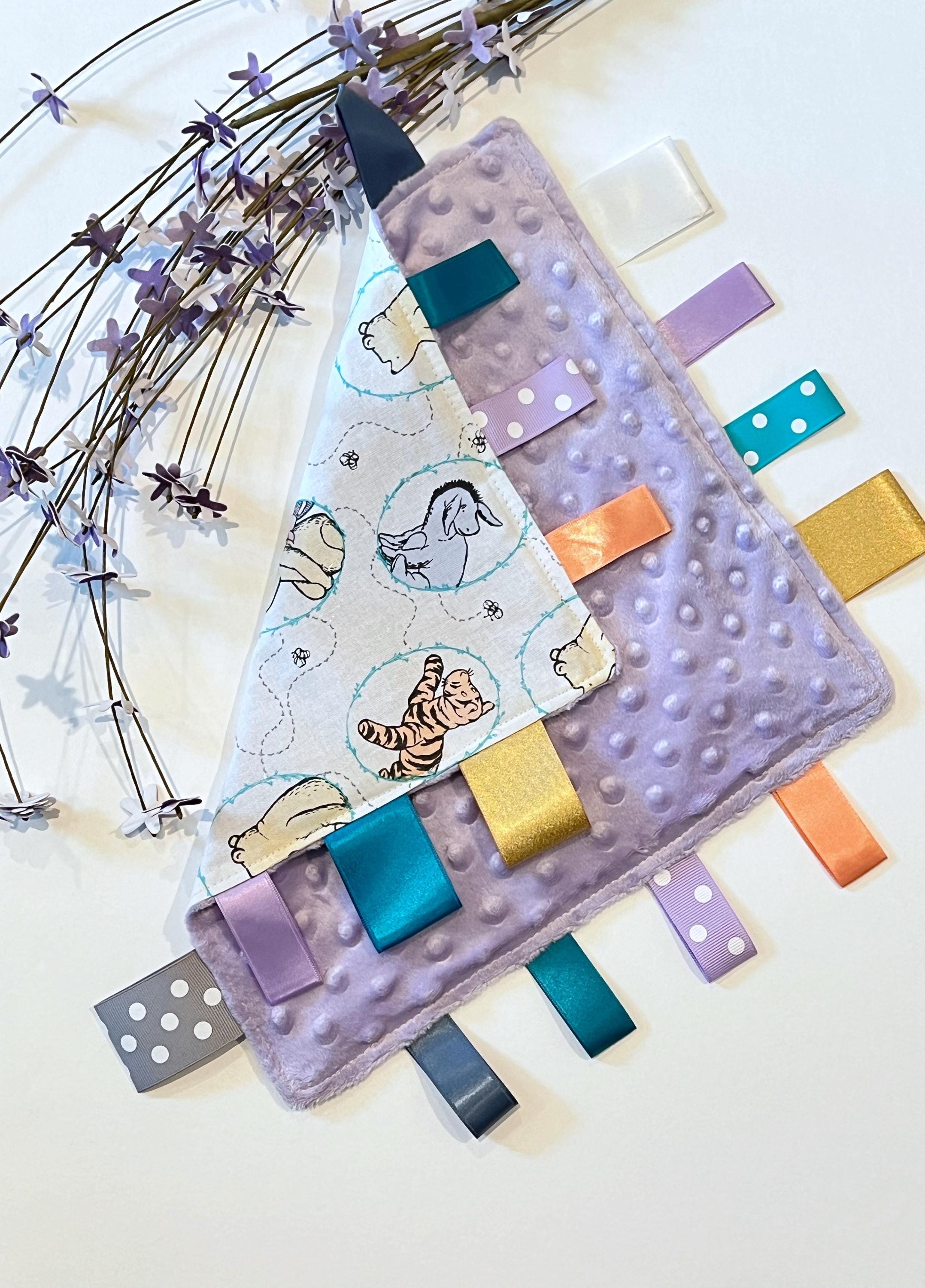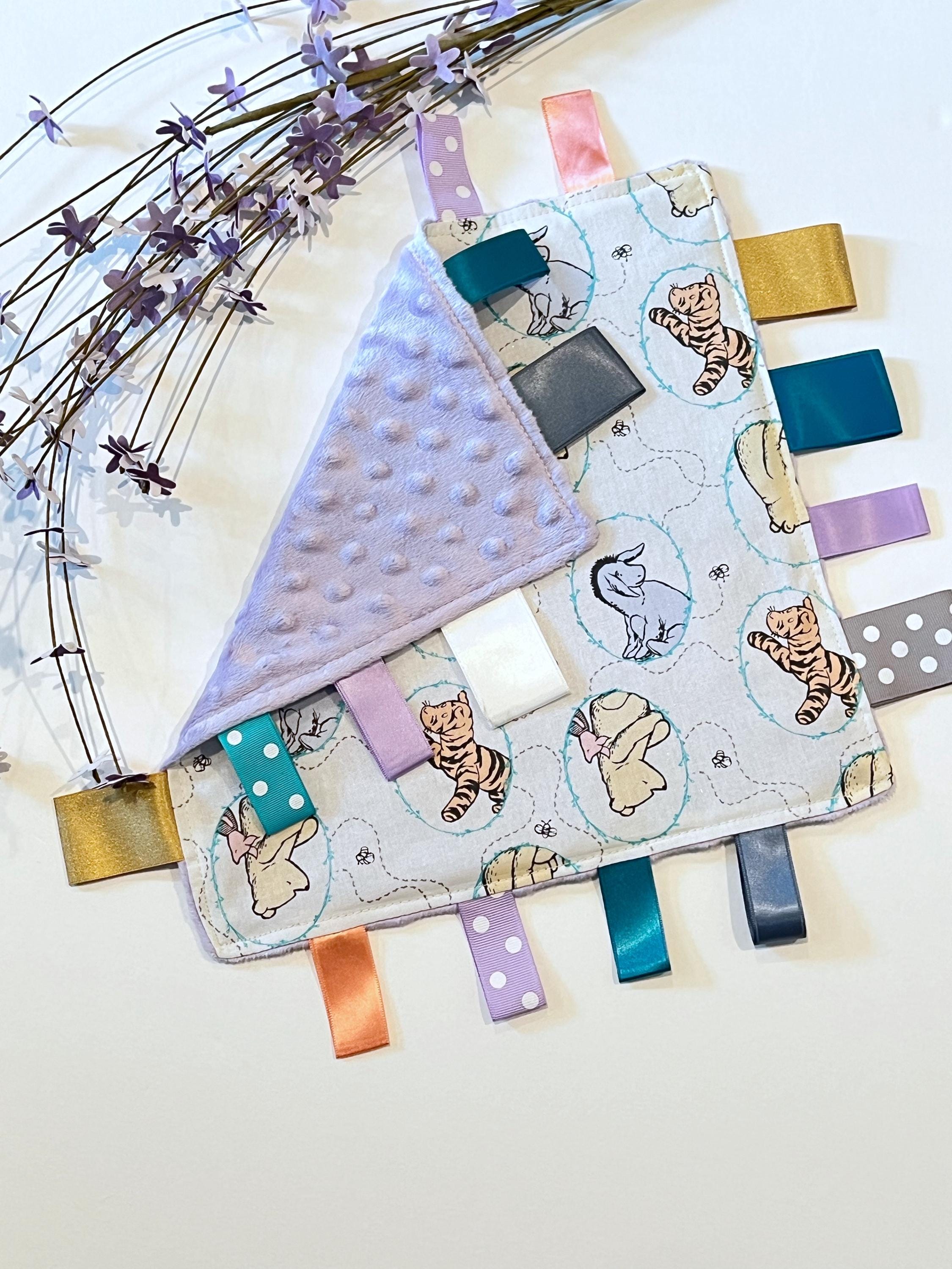 This baby sensory tag blanket is a lovey size made from the original inspired classic Winnie the Pooh Cotton fabric and minky.